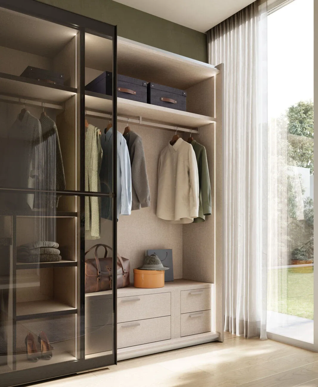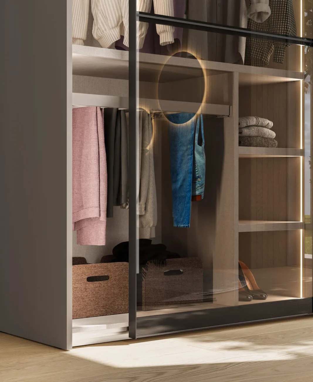 Armadio scorrevole Dama in Platino e vetro Fumè. Struttura in Cotone.