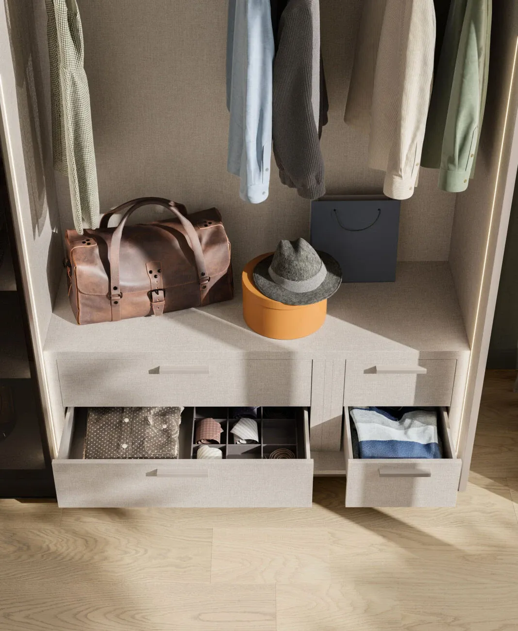 Colonna armadio attrezzata con ripiano, tubo, cassettiera e luci LED verticali.