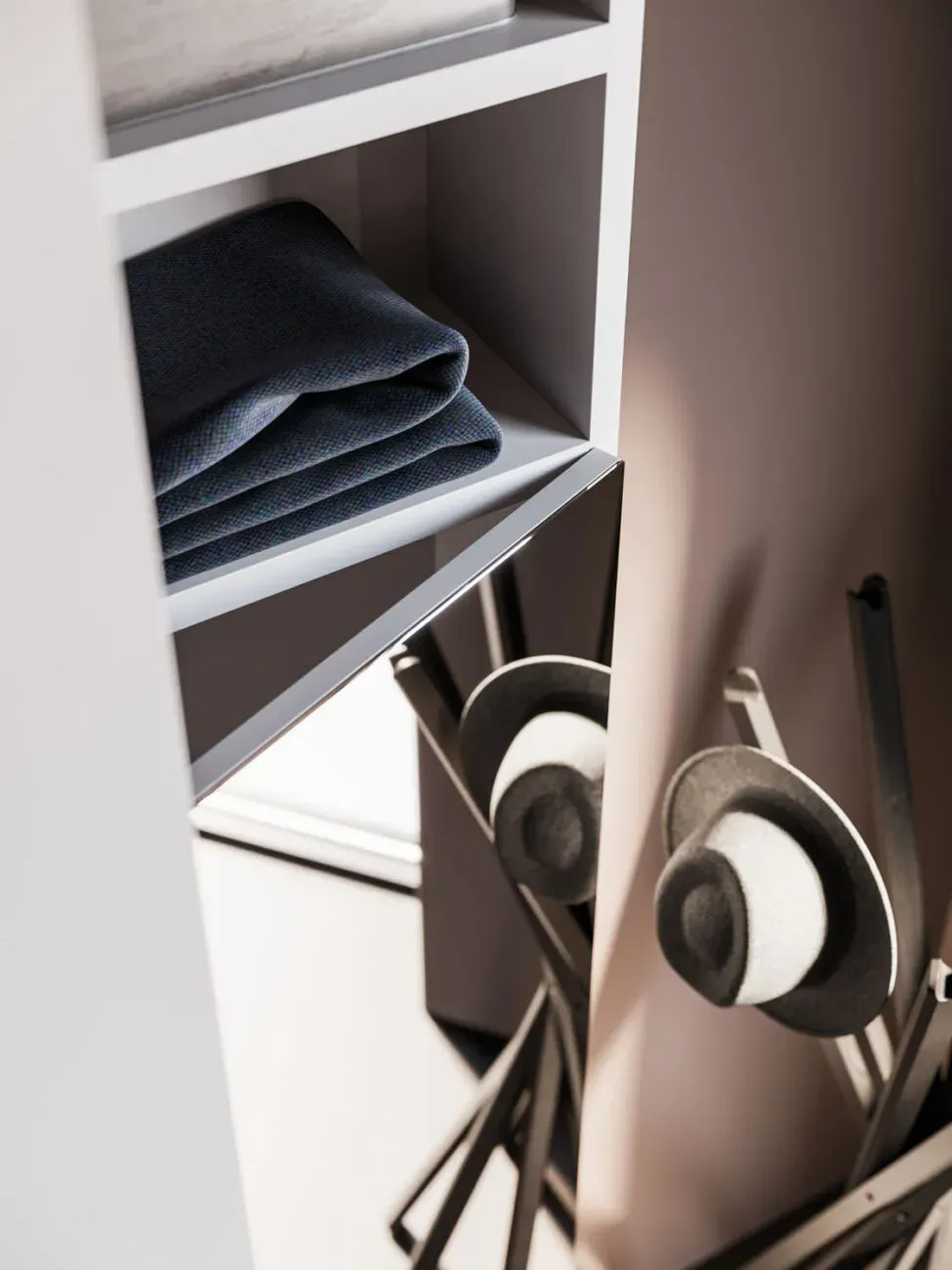 Elemento terminale con specchio, ripiani e tubo appendiabiti. Maniglia L17 in metallo brunito.