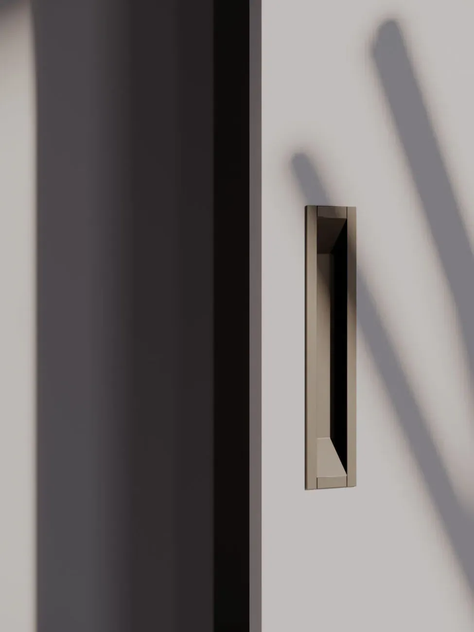 Armadio battente con anta Liscia e maniglia L17, con vano TV a giorno e ponte. Interno Cotone, ante in laccato opaco Piuma, vano TV a giorno in laccato opaco Nebbia.