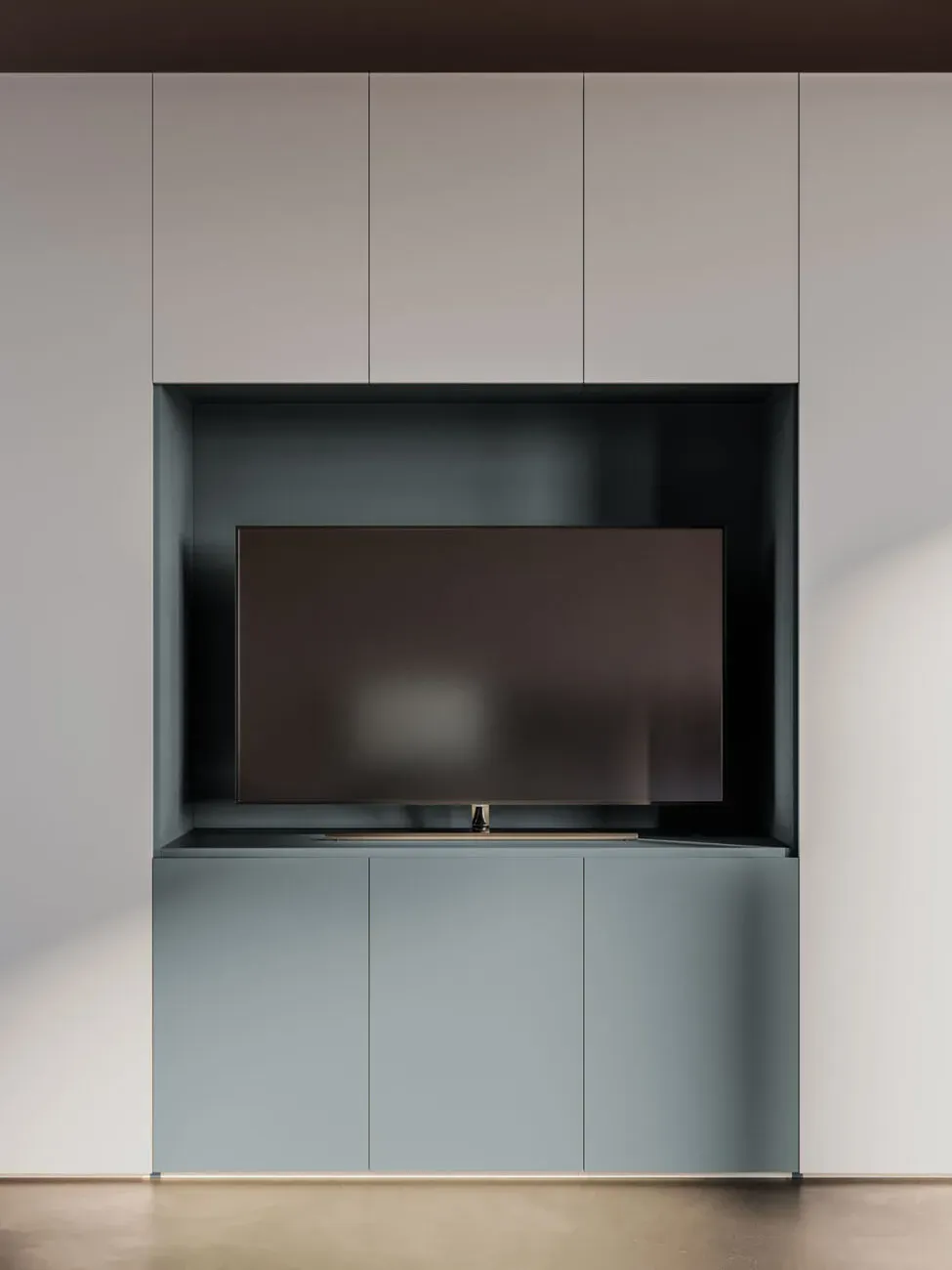 Interno Cotone, ante in laccato opaco Piuma, vano TV a giorno in laccato opaco Nebbia.