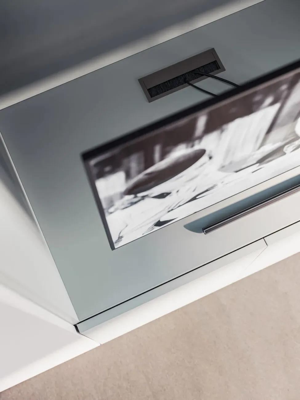 Vano TV a giorno con elemento ponte in laccato opaco Nebbia. Dettaglio passacavi in metallo brunito.