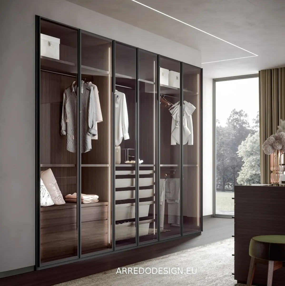 Domino glass ha cinque ante. La quantità di ante corrisponde abitualmente alle volumetrie all'interno: se vuoi una proposta pratica e per salvaguardare lo spazio, scegli armadiature a due ante, soluzione elegante e plurifunzionale per la zona notte.