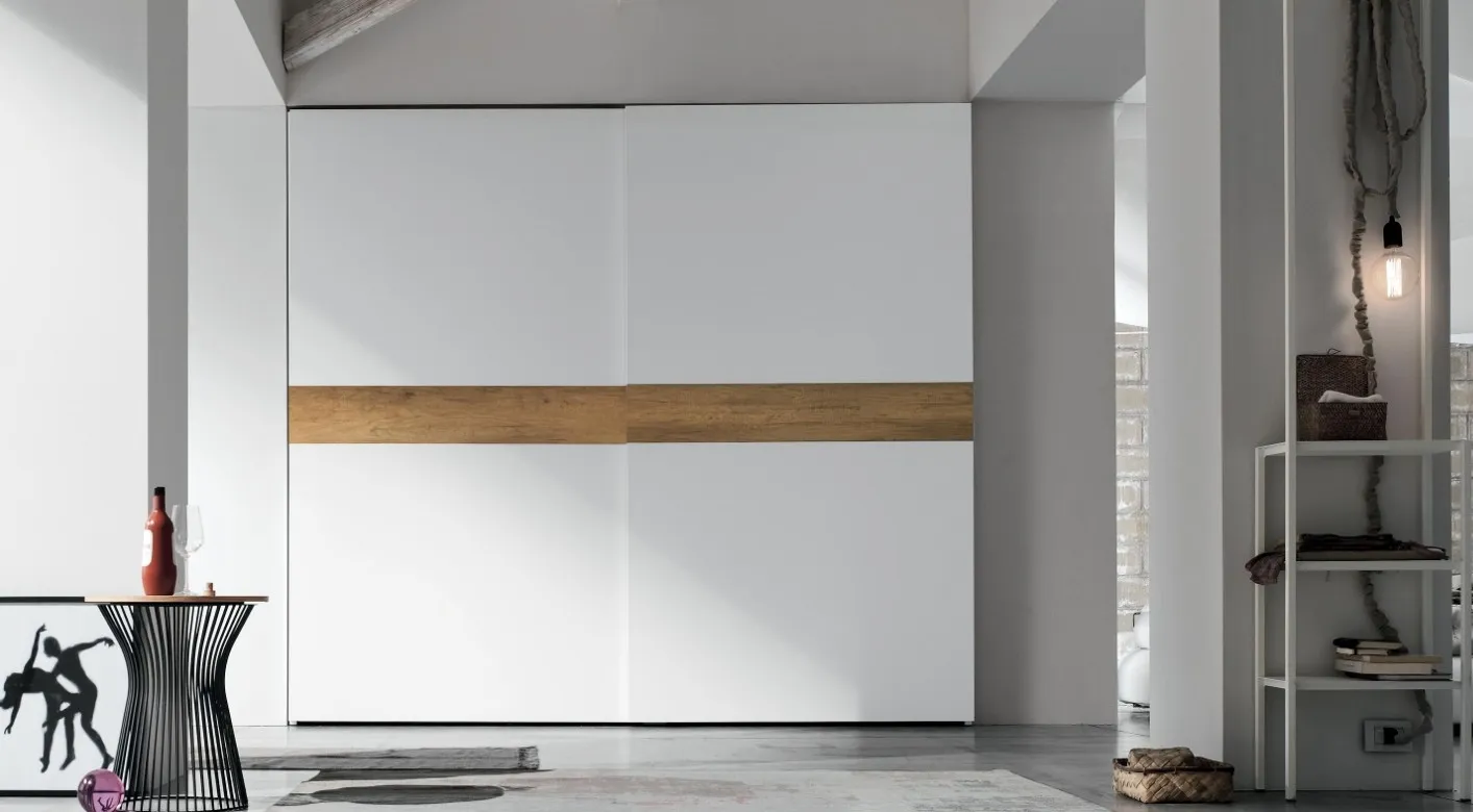 ARMADIO 2 ANTE SCORREVOLI MOD. TABLET LACCATO OPACO BIANCO GESSO, FASCIA IN MATERICO ROVERE NODATO CHIARO, STRUTTURA LACCATO OPACO BIANCO GESSO. L280 P67 H255 DISPONIBILE SU RICHIESTA IN MISURE DIVERSE, FINITURE DIVERSE E L'AGGIUNTA DI ACCESSORI INTERNI CONSEGNA ENTRO 40/60 GIORNI DALL'ACQUISTO