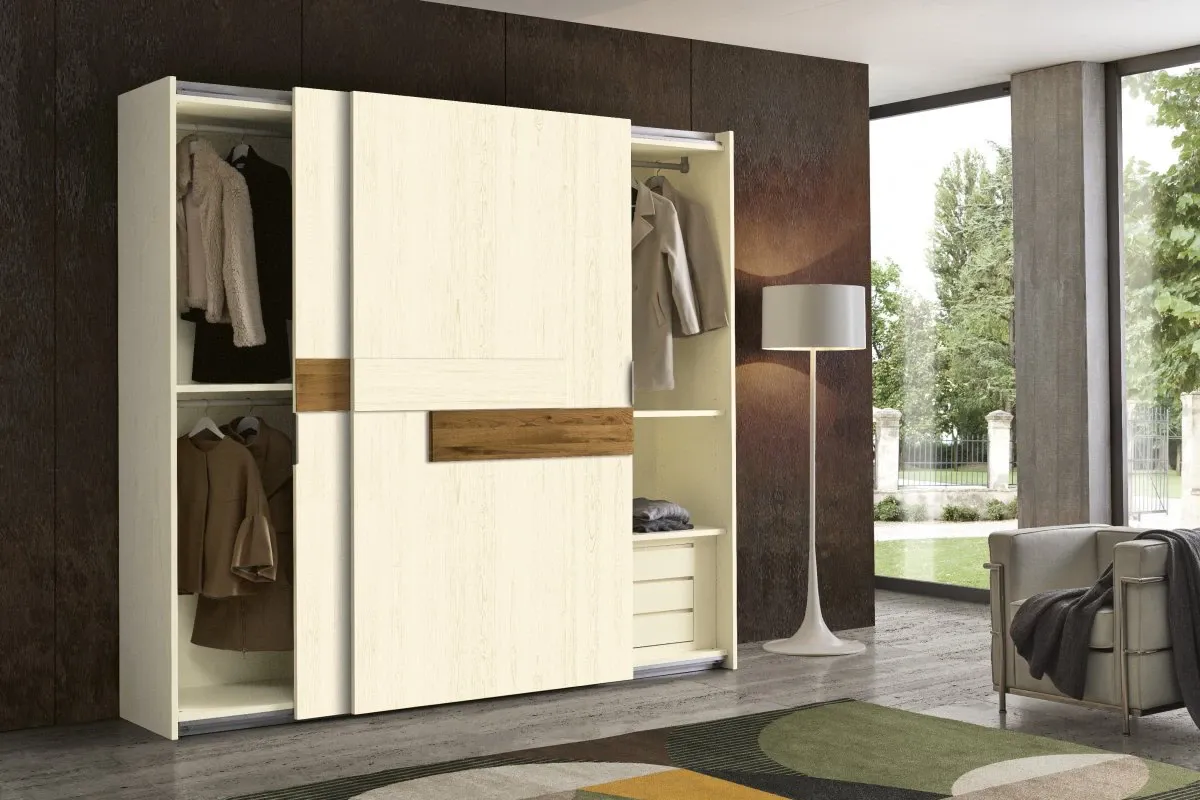 Armadio 2 ante scorrevoli l.265 h.247 p.63 in legno di rovere completo di cassettiera interna, 3 ripiani e 3 tubi appendiabito. Venatura verticale del legno con 2 inserti con venatura orizzontale con possibilità di un colore a contrasto oppure tutto in tinta. Lo proponiamo compreso Iva e trasporto a Euro 3.200,00 escluso montaggio. Tempi di consegna 30-40 giorni