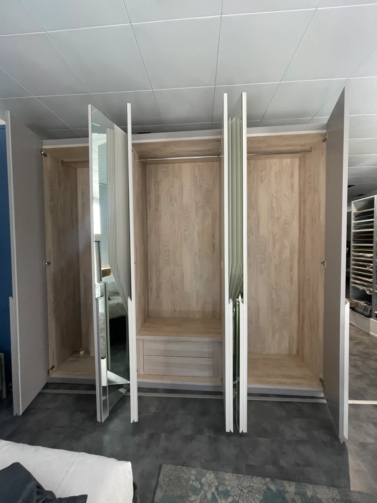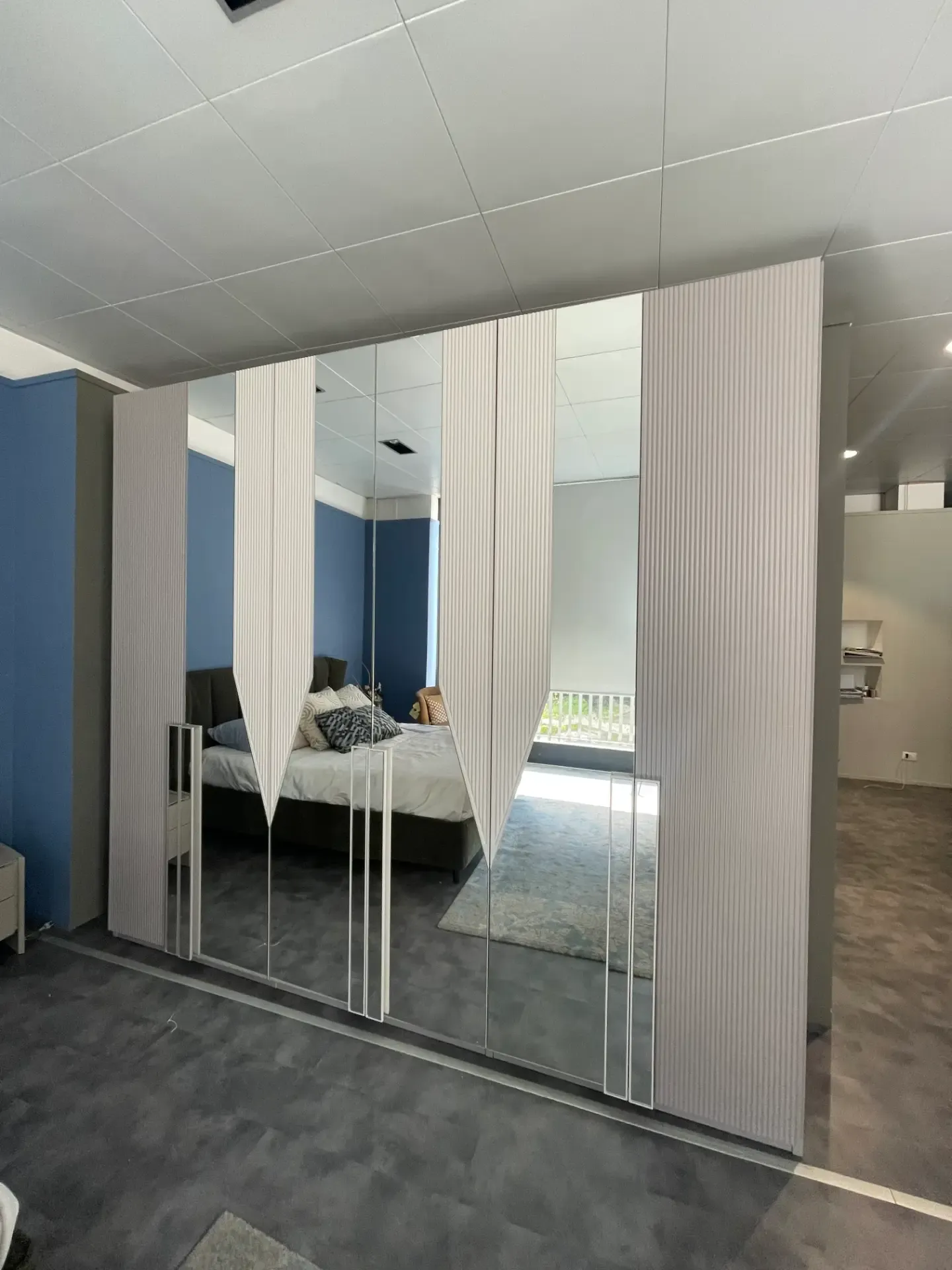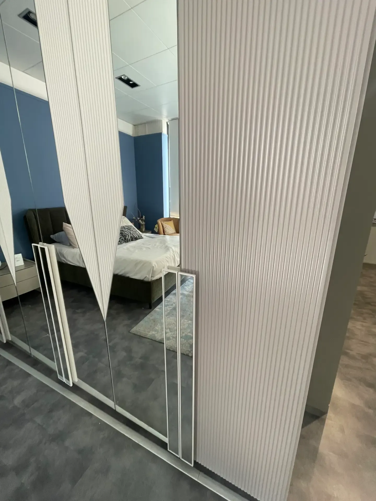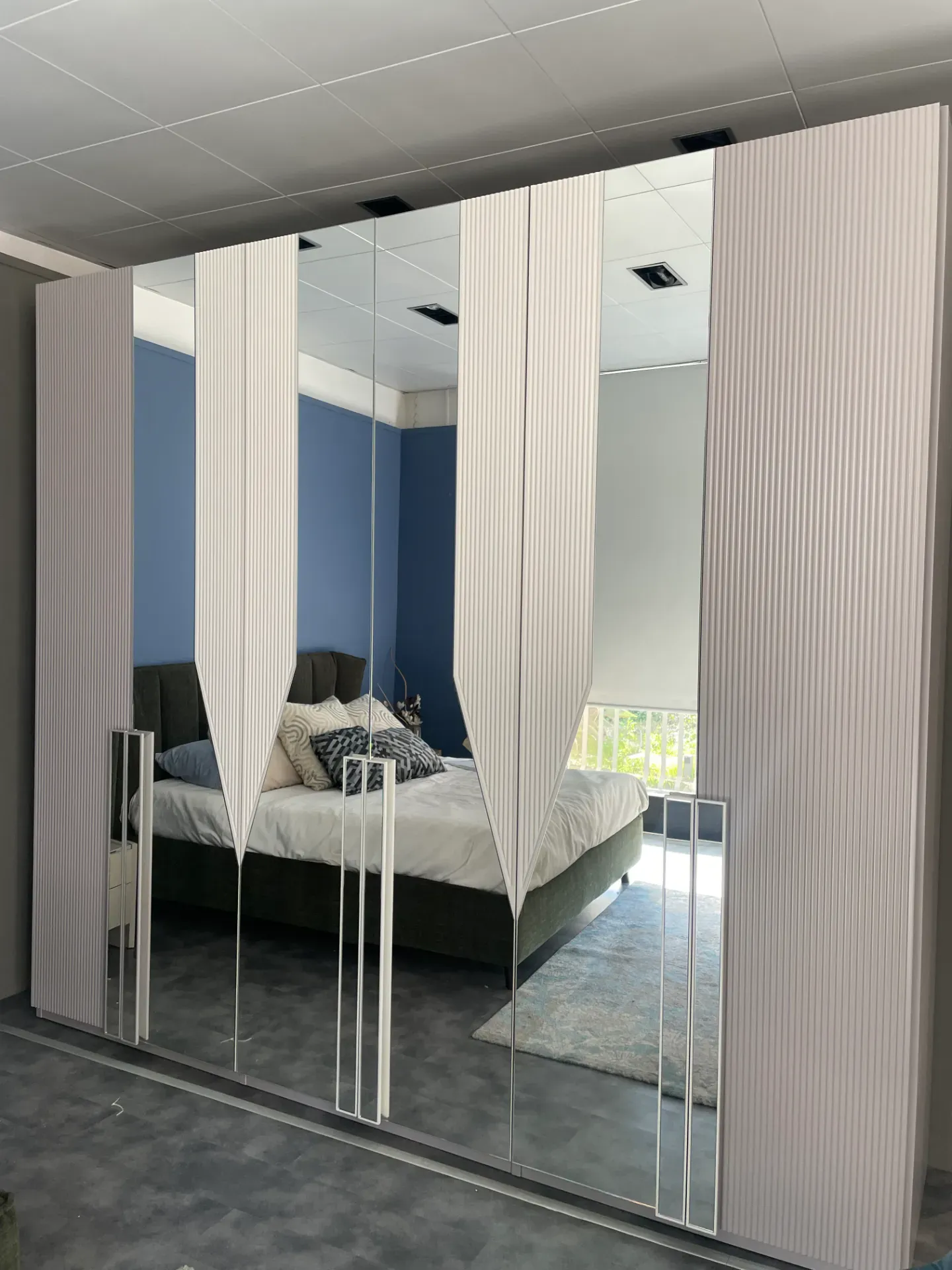 Armadio 6 ante battente flex porte collezione Lovely frontale laccato opaco cannette' brezza e macchiato e riporti specchio naturale maniglione specchio interno effetto legno con cassettiera 2 cassetti vano centrale e ripiani con tubi appendiabiti.