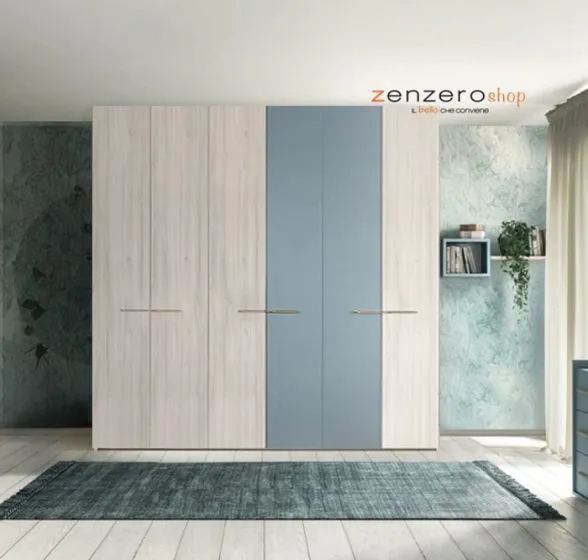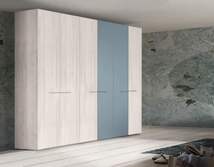 L'armadio moderno presenta 4 ante battenti in finitura Ciliegio bianco alternato a quella Cenere. E' possibile scegliere tra un'ampia gamma di colori per personalizzarlo e adattarglio al meglio secondo i propri gusti. Il suo design semplice ed elegante assicura comfort e rende l'ambiente caldo e accogliente.