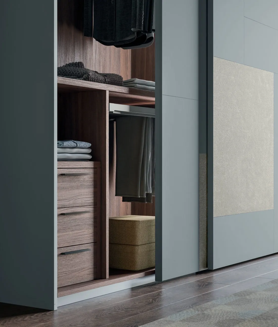 L'armadio è realizzato con finitura in laccato opaco e cemento, con ante scorrevoli e maniglione in profilo di alluminio in altezza.