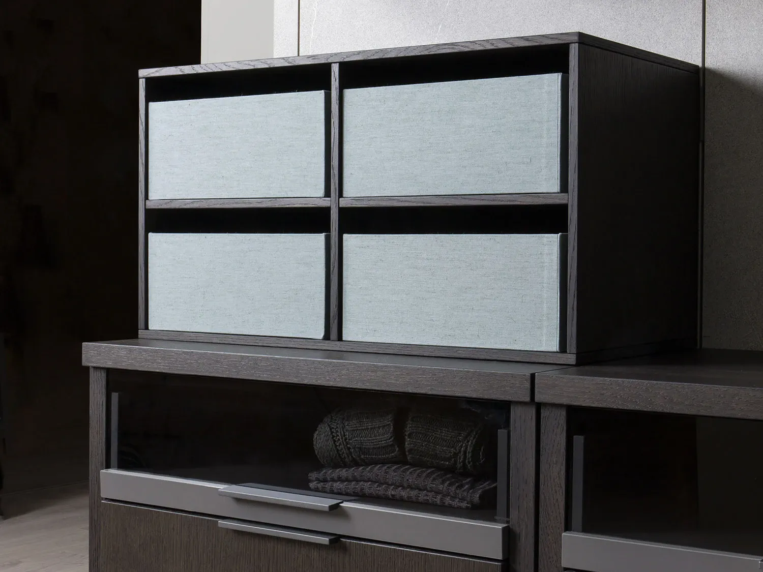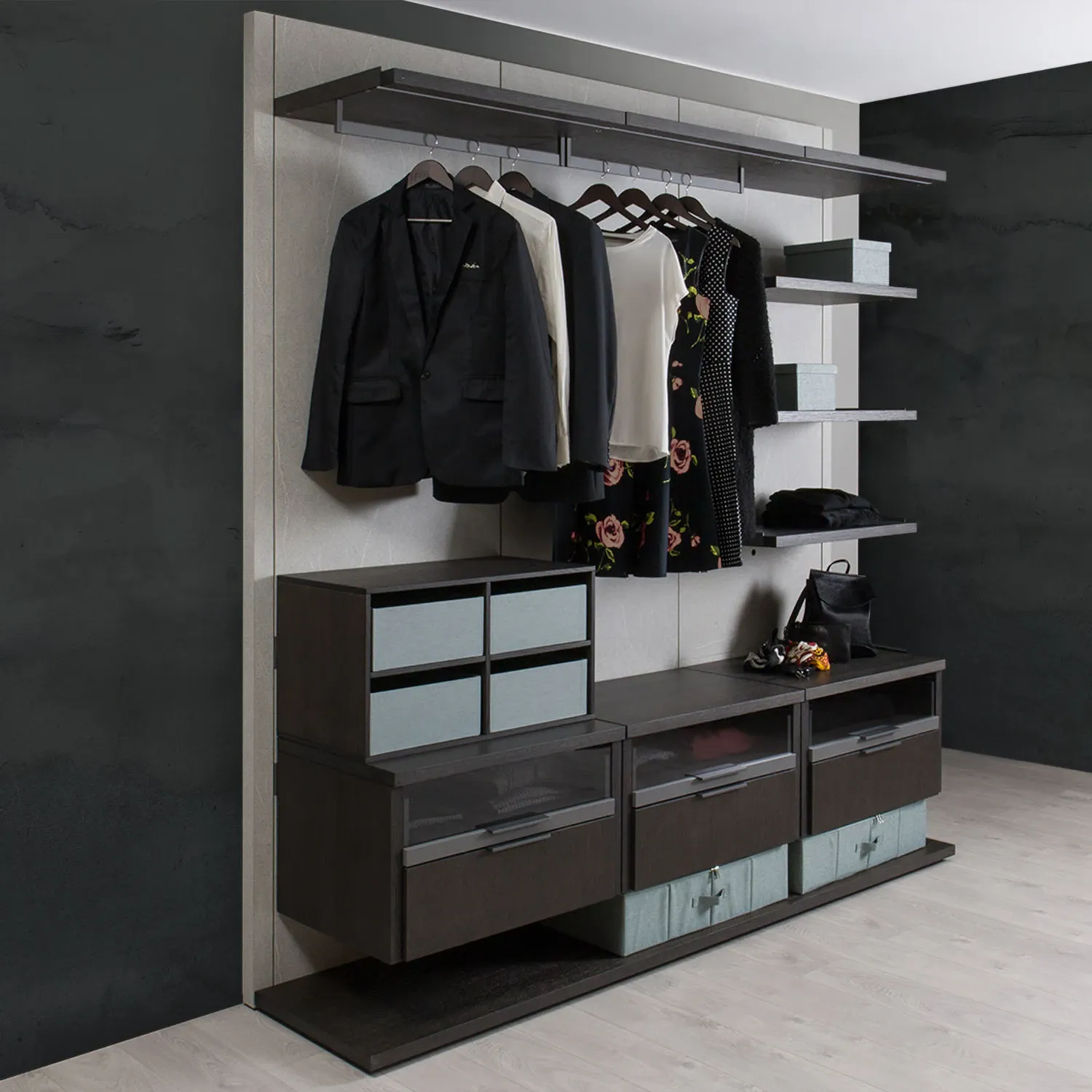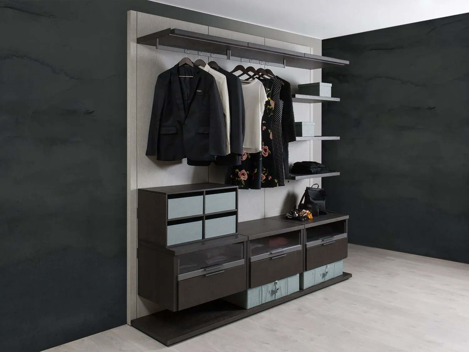 Proposta in una elegante doppia finitura, abbina i pannelli di schienale in nobilitato effetto Pietra Piasentina alle attrezzature in legno Fashion Wood Rovere Carbone, dando vita a un raffinato contrasto materico di grande impatto estetico. La composizione comprende panca a terra, cassettiere sospese, raster con contenitori rivestiti in tessuto, ripiani e tubi appendiabiti, offrendo una soluzione completa e versatile per organizzare al meglio ogni elemento del guardaroba.