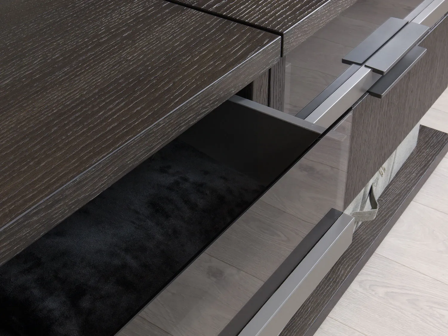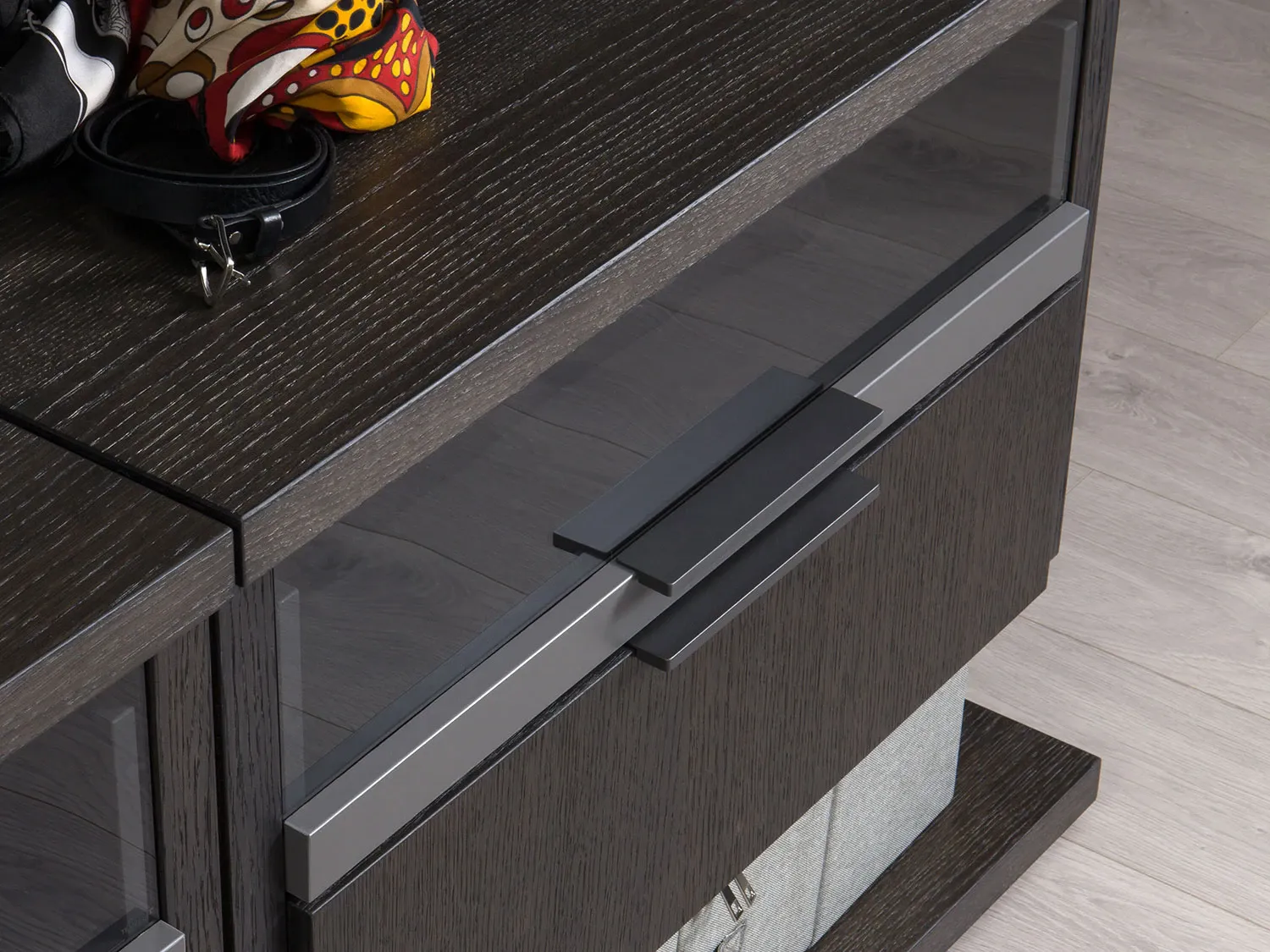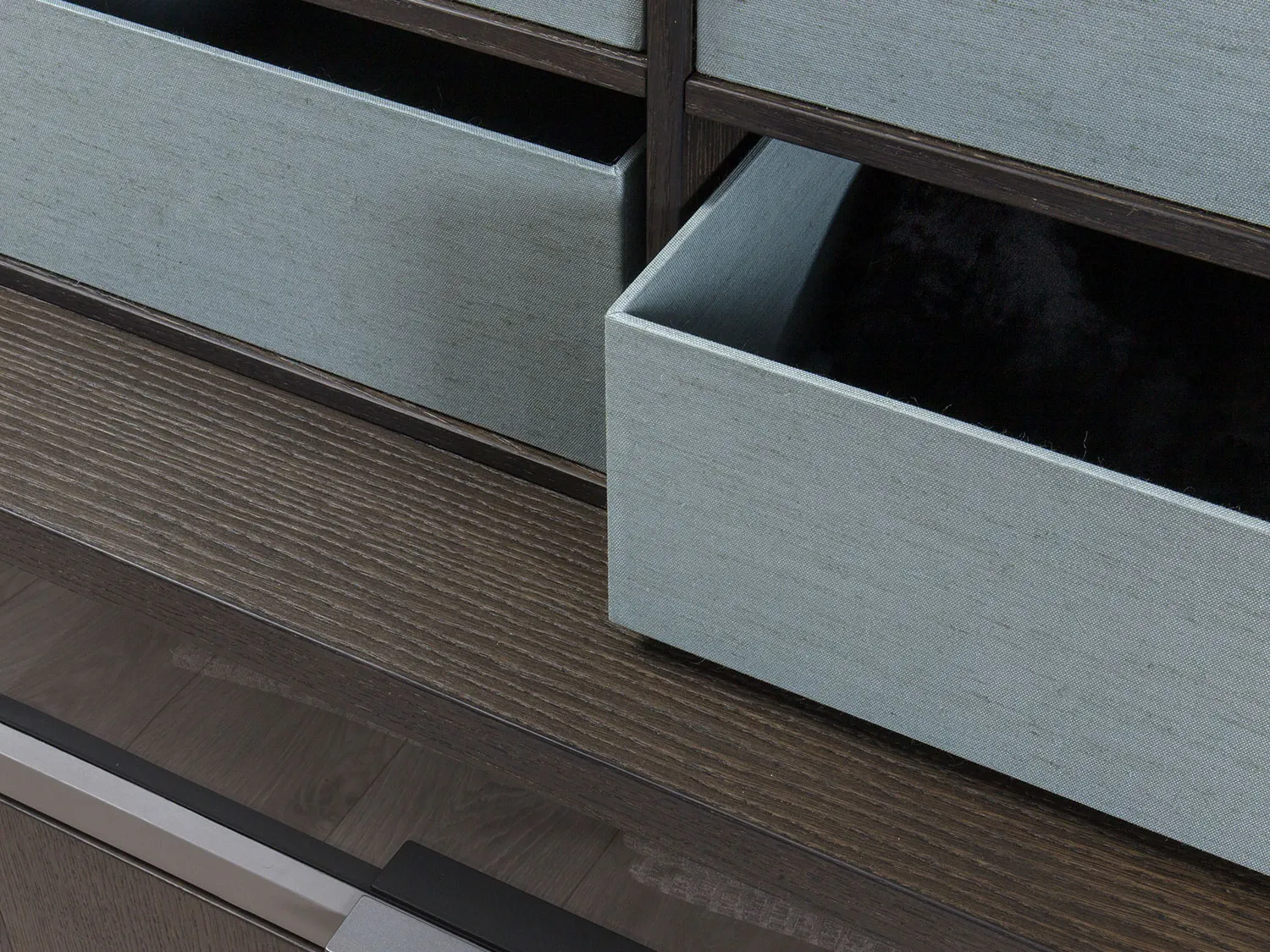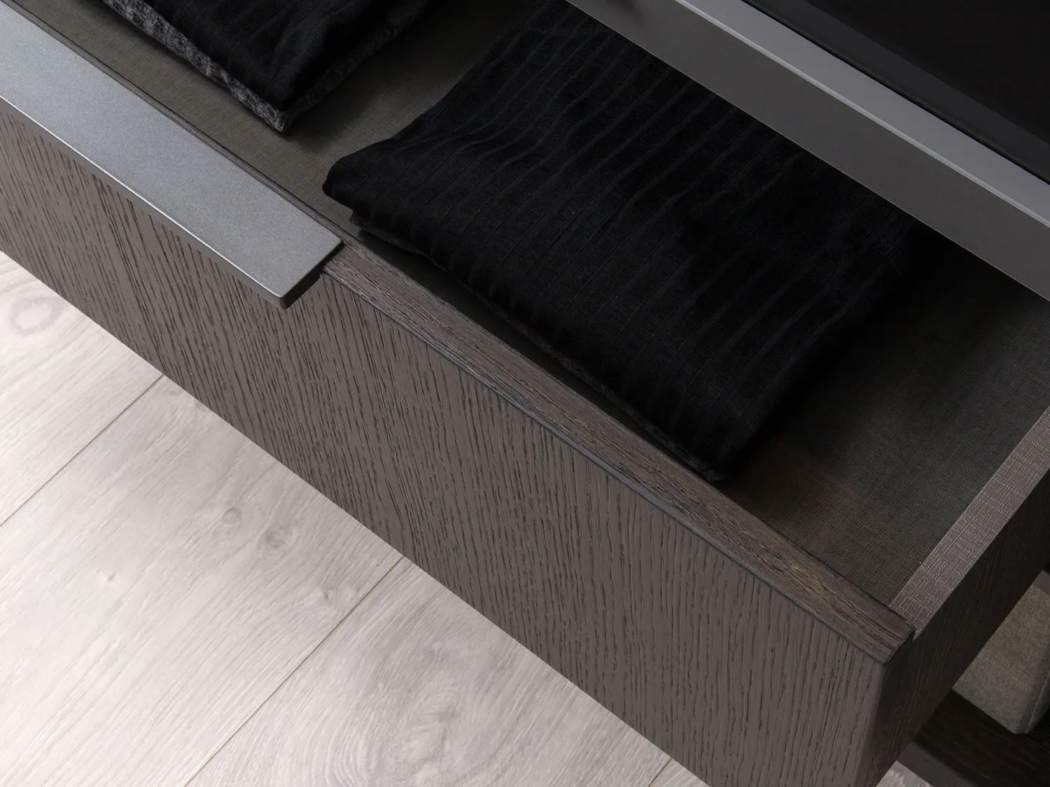 Proposta in una elegante doppia finitura, abbina i pannelli di schienale in nobilitato effetto Pietra Piasentina alle attrezzature in legno Fashion Wood Rovere Carbone, dando vita a un raffinato contrasto materico di grande impatto estetico. La composizione comprende panca a terra, cassettiere sospese, raster con contenitori rivestiti in tessuto, ripiani e tubi appendiabiti, offrendo una soluzione completa e versatile per organizzare al meglio ogni elemento del guardaroba.