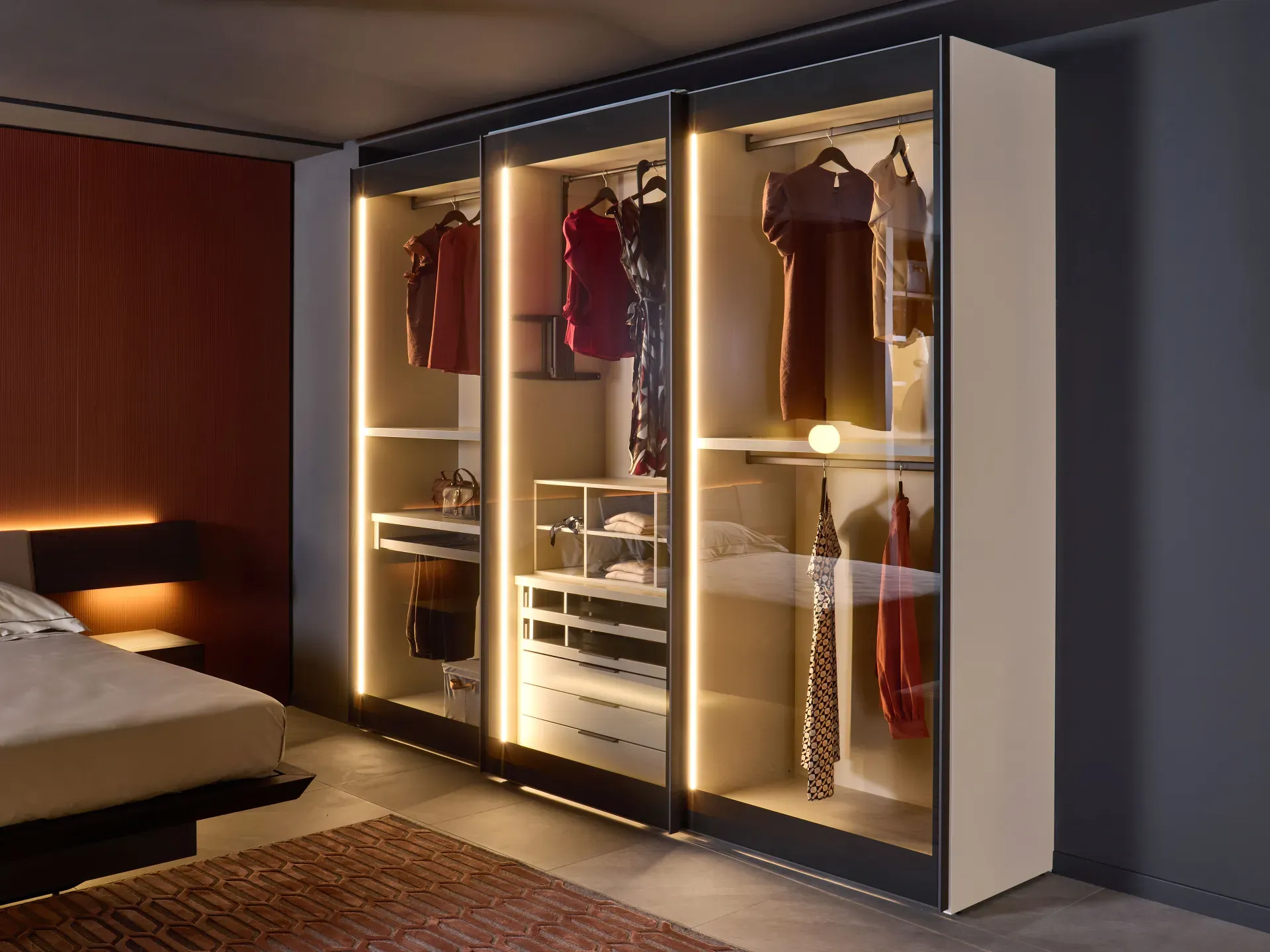Ad illuminare l'interno, tre barre Led incassate in fresata diffondono una luce morbida e uniforme, esaltando l'eleganza dell'armadio e assicurando una visibilità impeccabile.