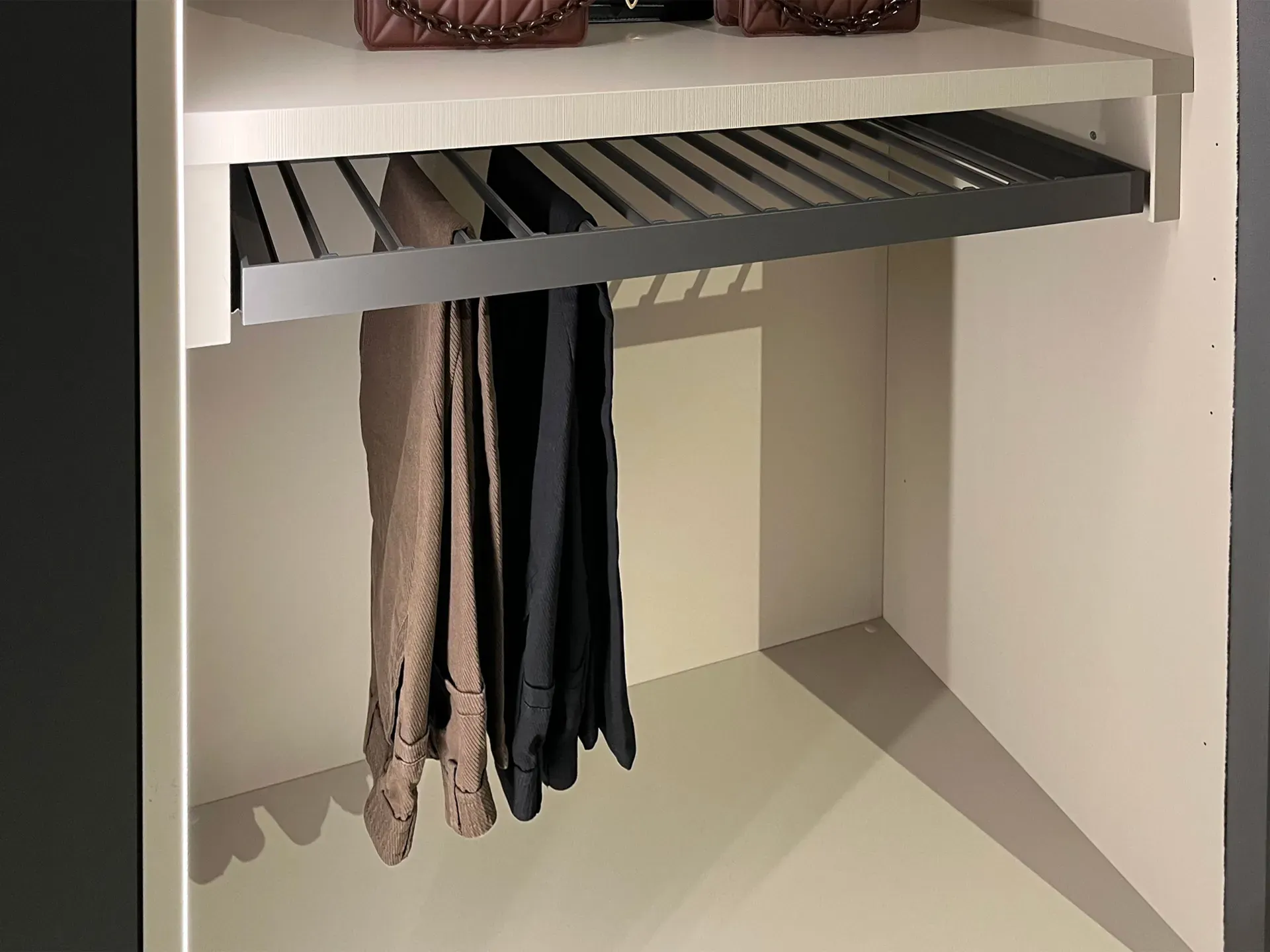 L'interno è studiato all'insegna della praticità e della funzionalità, arricchito da accessori che ne aumentano il valore e garantiscono un comfort d'uso ottimale. Tra gli elementi più caratteristici troviamo il porta pantaloni estraibile e la cassettiera completa di raster porta camicie in appoggio. Nel modulo centrale è integrato uun servetto estraibile, che permette di appendere i capi con estrema facilità e senza il minimo sforzo, mentre i due vani laterali sono equipaggiati con tubi appendiabiti.