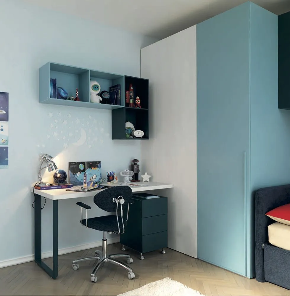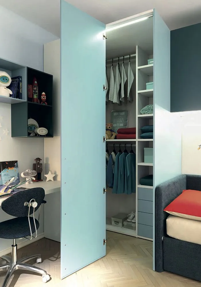Questa soluzione di armadio è studiata per ottimizzare al massimo lo spazio a disposizione. L'anta battente infatti da accesso all'interno dell'armadio che ha una notevole profondità, viene così garantito un ampio spazio di appoggio per la tua zona notte. L'armadio è dotato di 3 ripiani interni e 6 tubi appendiabiti, come optional è possibile richiedere ulteriori ripiani e la cassettiera a 4 cassetti.