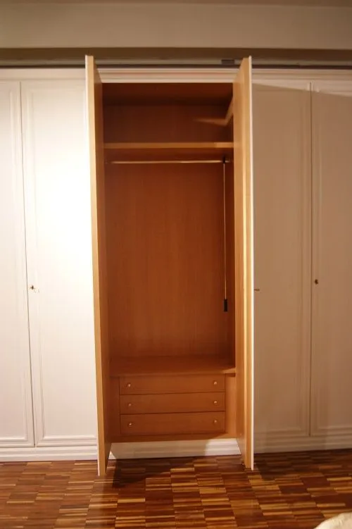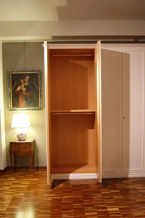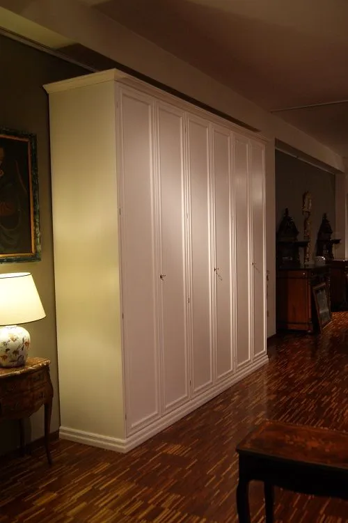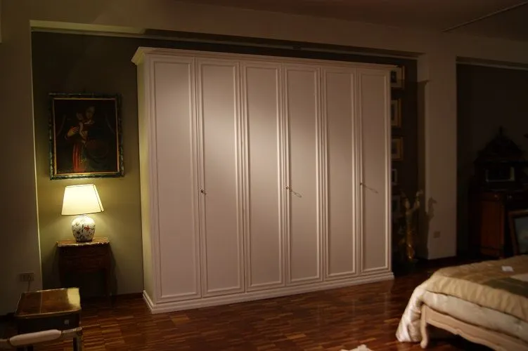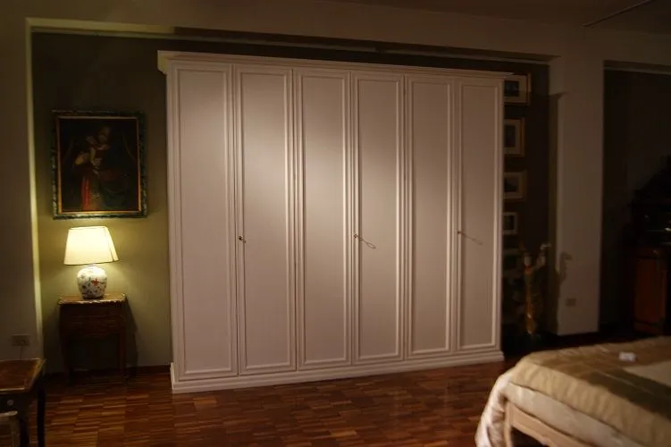 Armadio Leonardo By Domus da noi proposto in laccato bianco francese (senza sciupature) a 6 ante battenti con cassettiera interna a 3 cassetti.