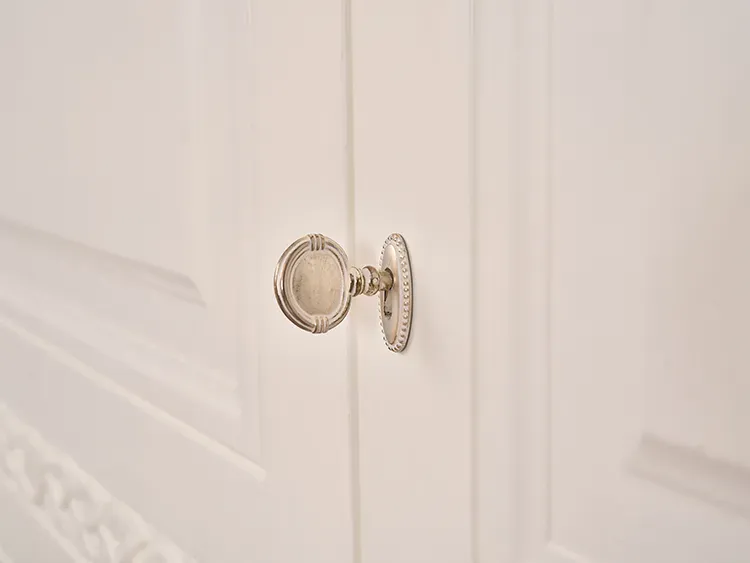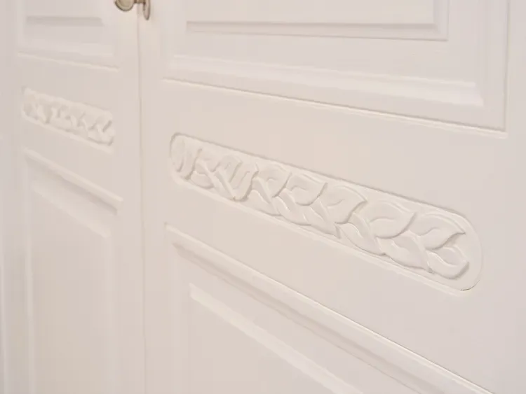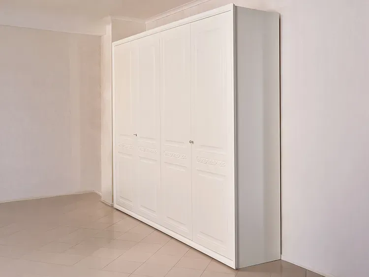 Armadio Benedetti Mobili mod. Cedro con Portale 4 ante battenti con chiave argento sbiancato - struttura interamente in tamburato di legno interni impiallacciati in Noce Tanganica - finitura esterna Smalto pennellato bianco senza sopracolore - attrezzatura interna: Cassettiera interna 3 cassetti cm L 141,3 x h 61,6; nr. 2 ripiano interno sp. 4 cm; nr 3 tubo appendiabiti L 141,3 cm