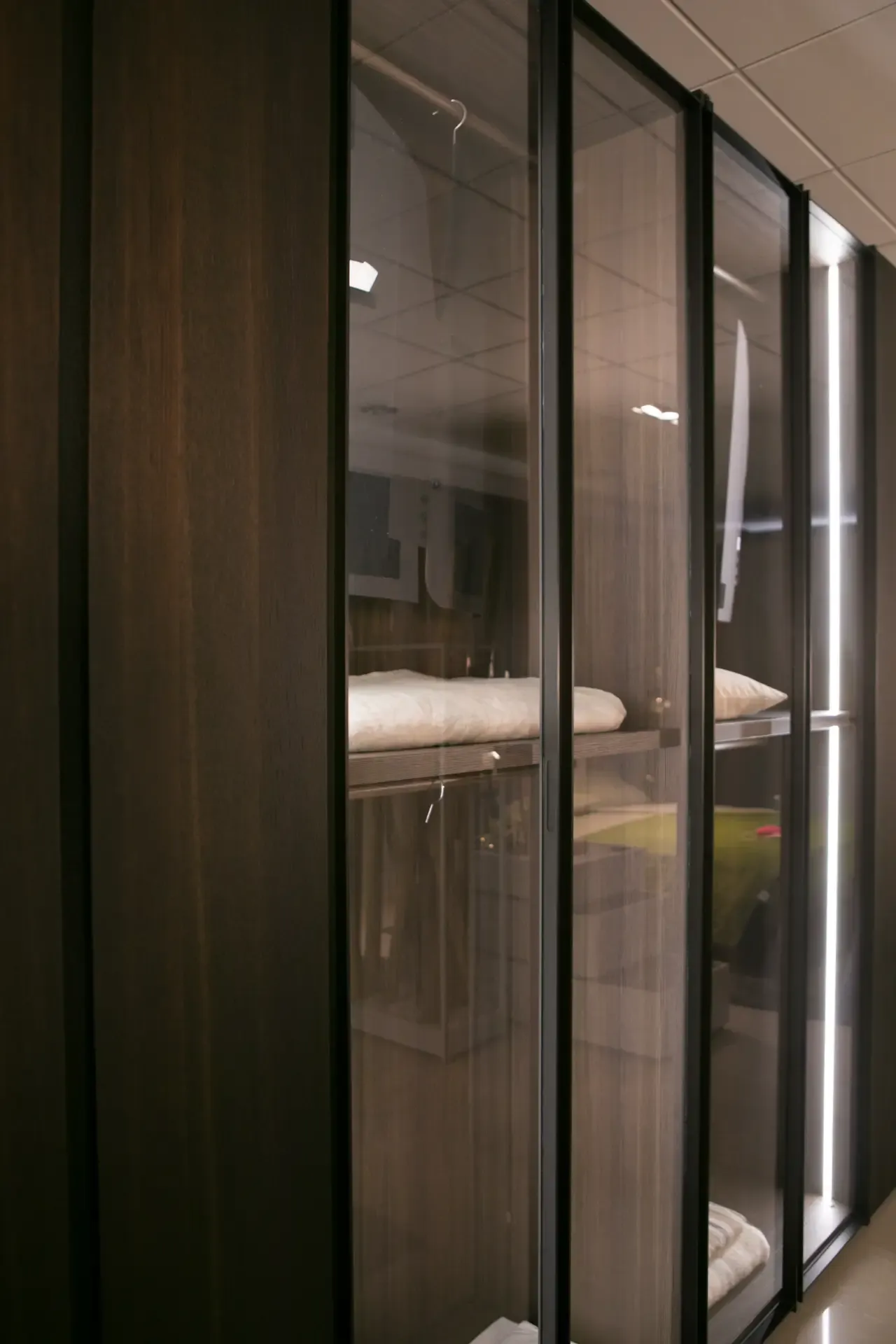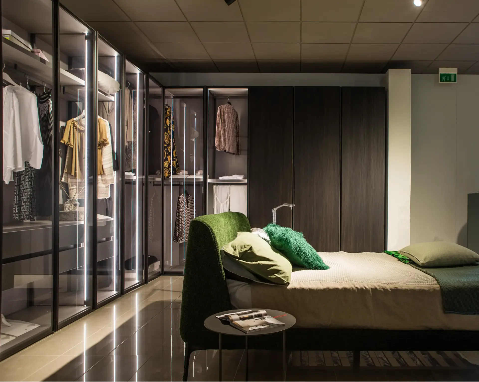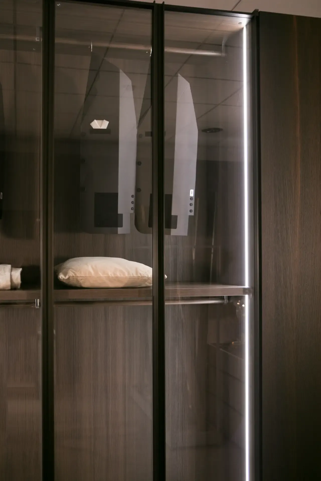 Mostrare o nascondere, contenere o esporre: l armadio battente Perry si riconosce dall anta a telaio in vetro fume' combinata con il modulo in olmo termotrattato. L armadio, a incasso o a muro, è dotato del sistema di apertura Panorama, che consente di aprire l anta a 180 gradi anche nel modulo ad angolo, così da rendere ancora più accessibili i vani interni.