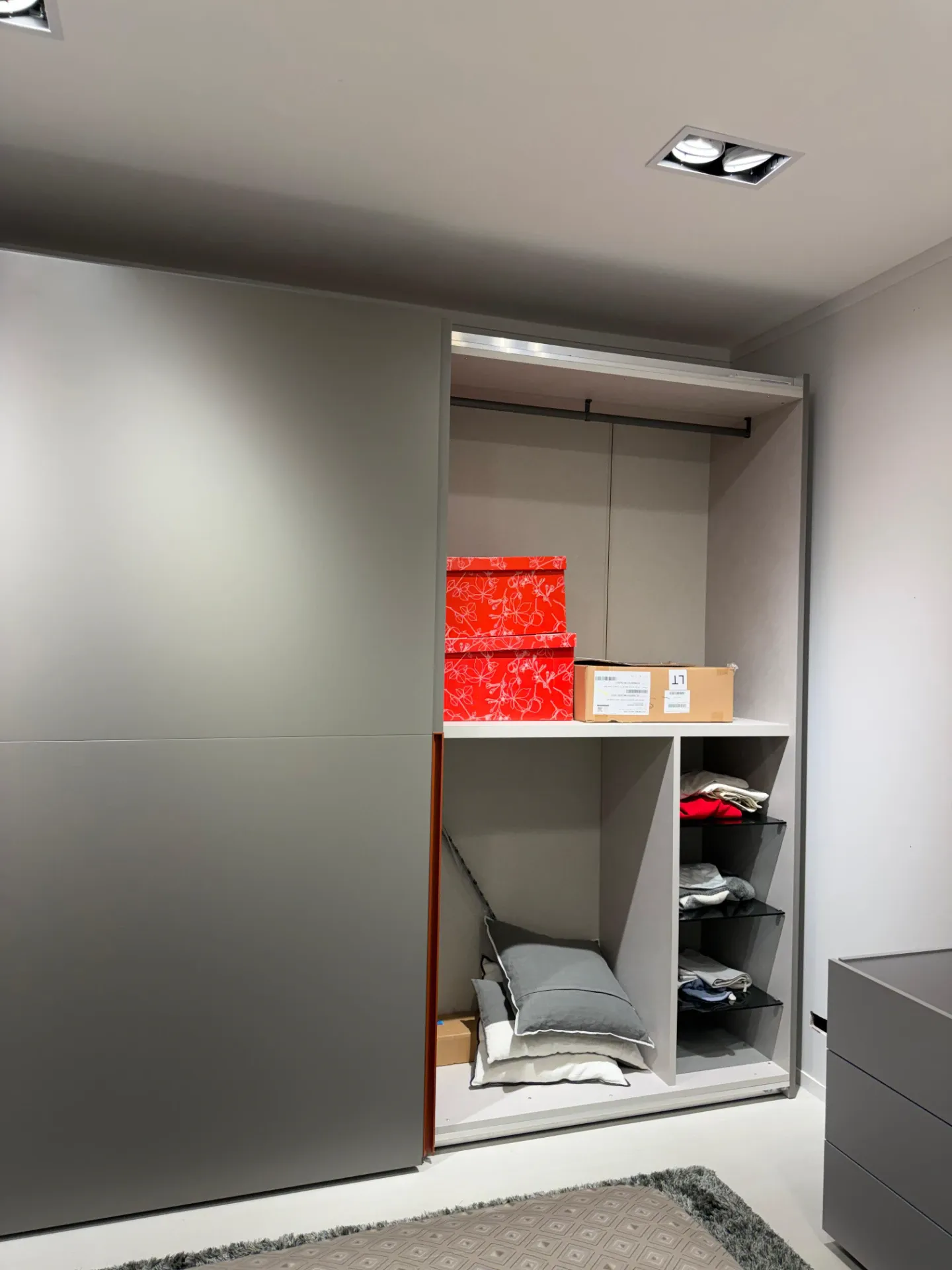 Dettagli: Armadio laccato opaco color salina, maniglia color tabasco