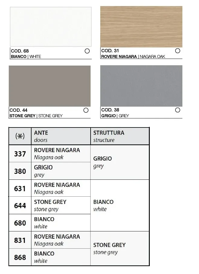 Struttura e ante in pannelli sp. mm 25 nobilitati in melaminico rifinito con bordo ABS mm 2 in tinta con la superficie.
