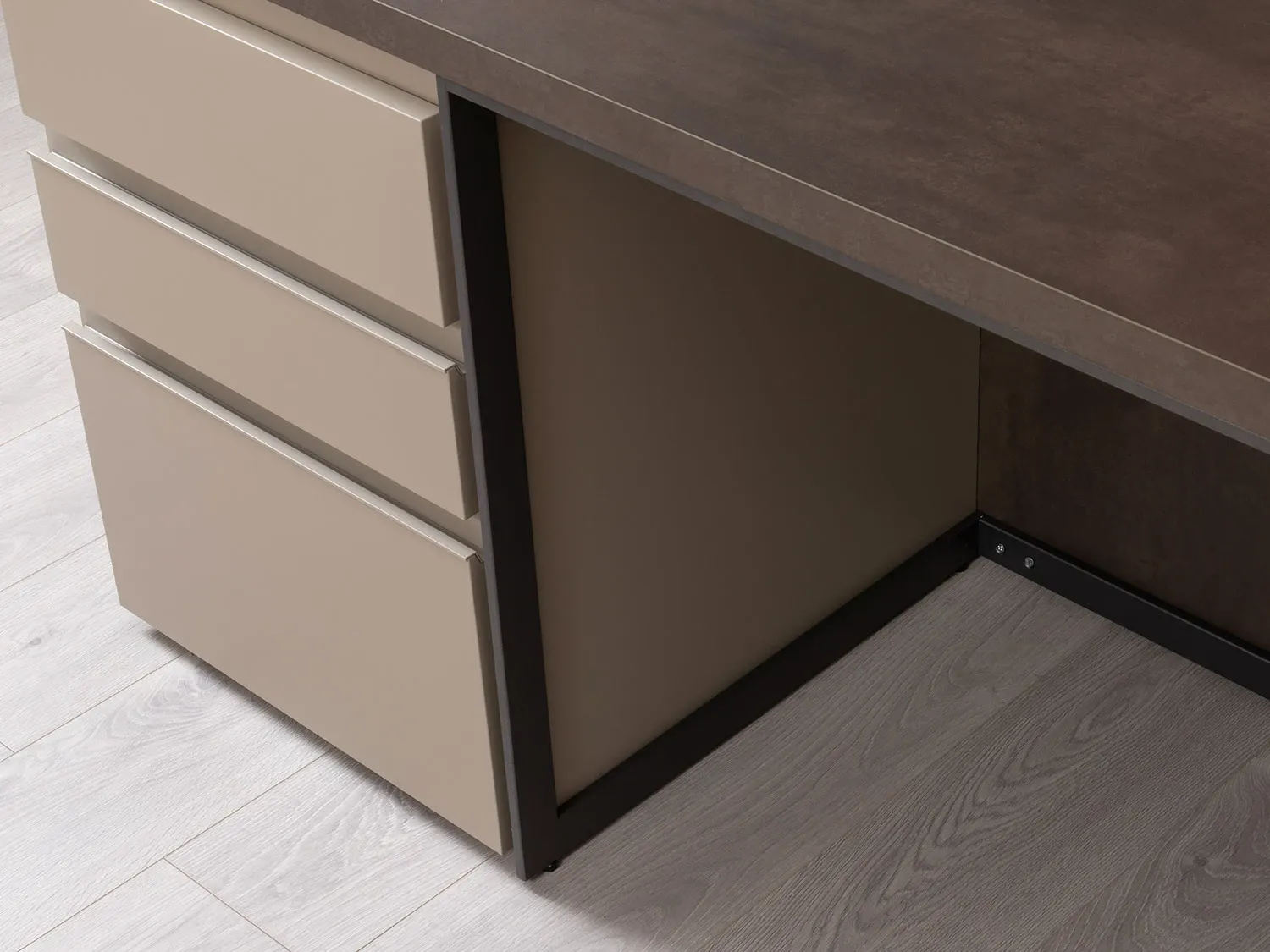La zona studio è progettata per essere pratica ed accogliente: il piano scrivania in nobilitato effetto materico, coordinato alla schienale, crea continuità stilistica e carattere. Le mensole e le vaschette portaoggetti in metallo offrono soluzioni intelligenti per mantenere tutto in ordine. Completa l'area di lavoro una funzionale cassettiera con un cestone e due cassetti posizionata a sinistra sotto il piano scrivania.