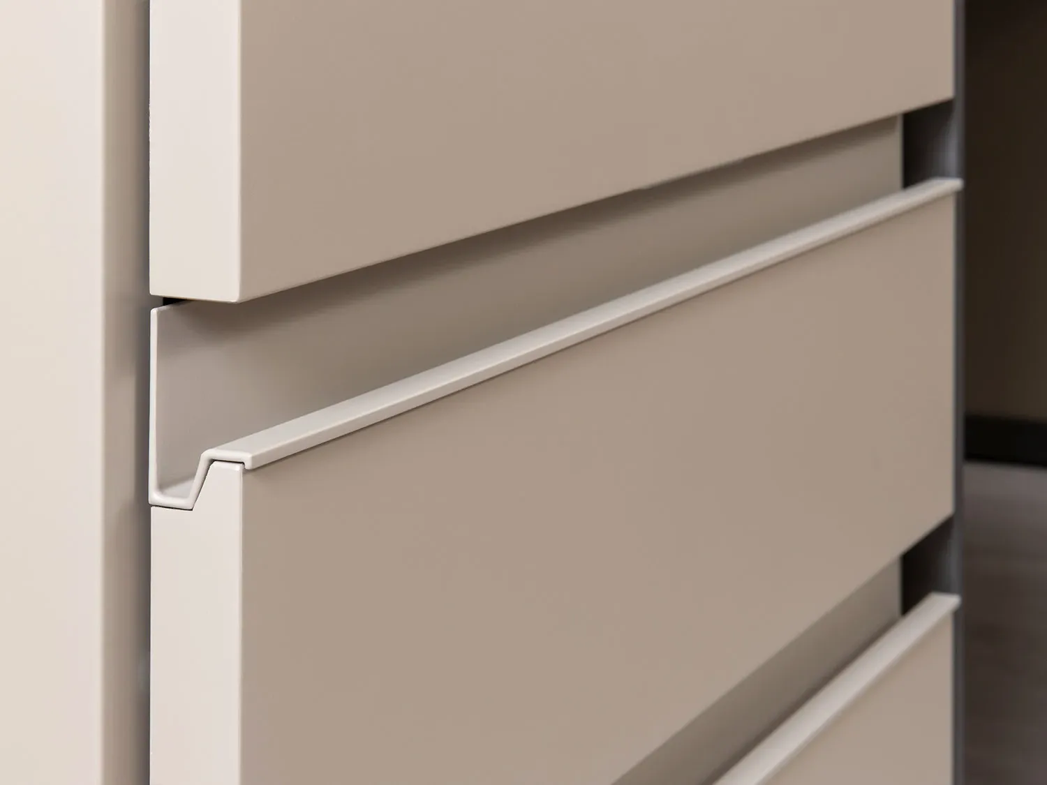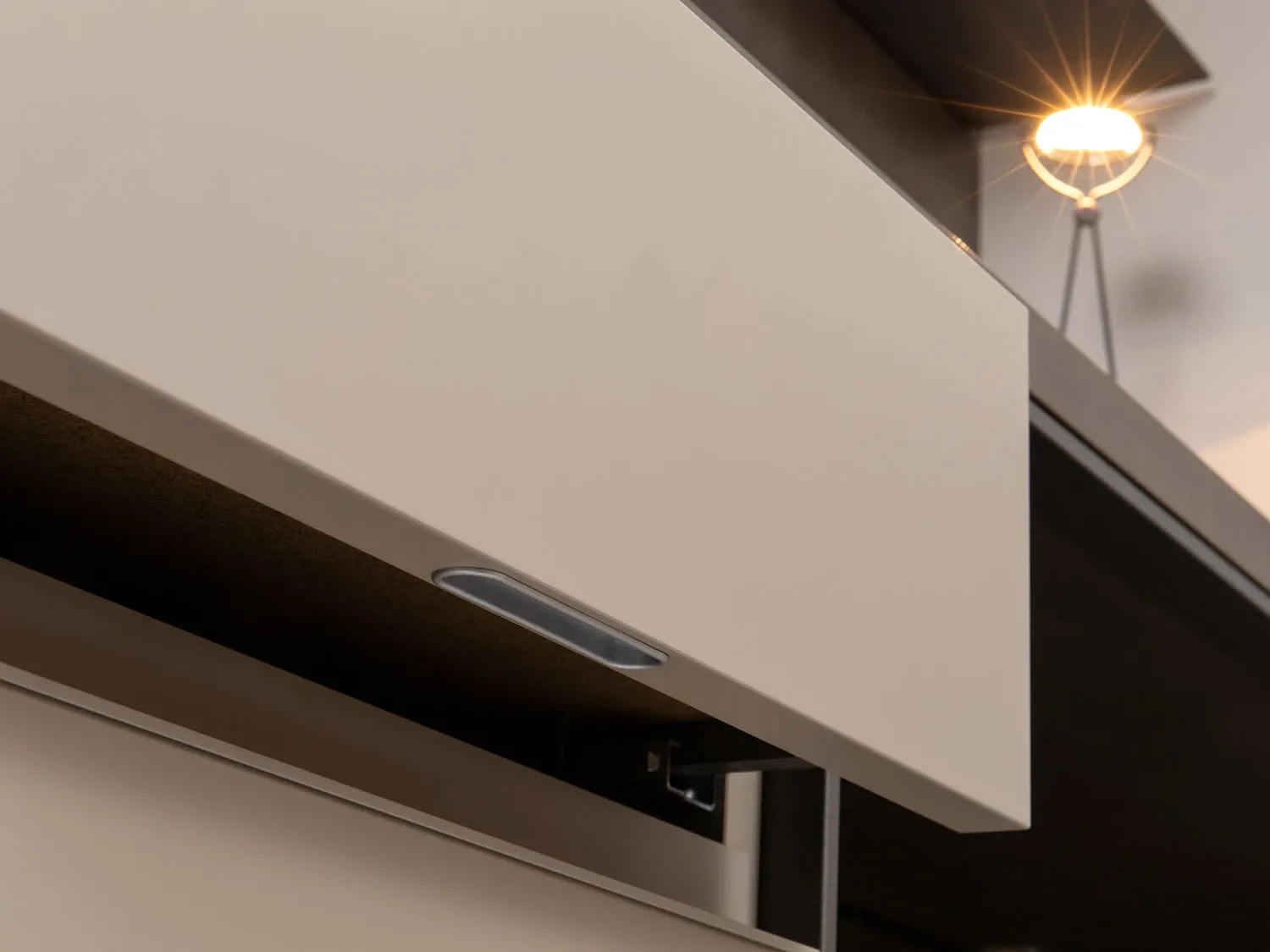 La composizione garantisce una elevata capacità contenitiva grazie ai pensili superiori con ripiano interno e all'armadio con due ante battenti, completo di ripiano e tubi appendiabiti per organizzare al meglio ogni spazio. Le ante, prive di maniglie, sono valorizzate da un'unghiatura a tutta altezza che ne esalta l'estetica moderna e la pulizia visiva.