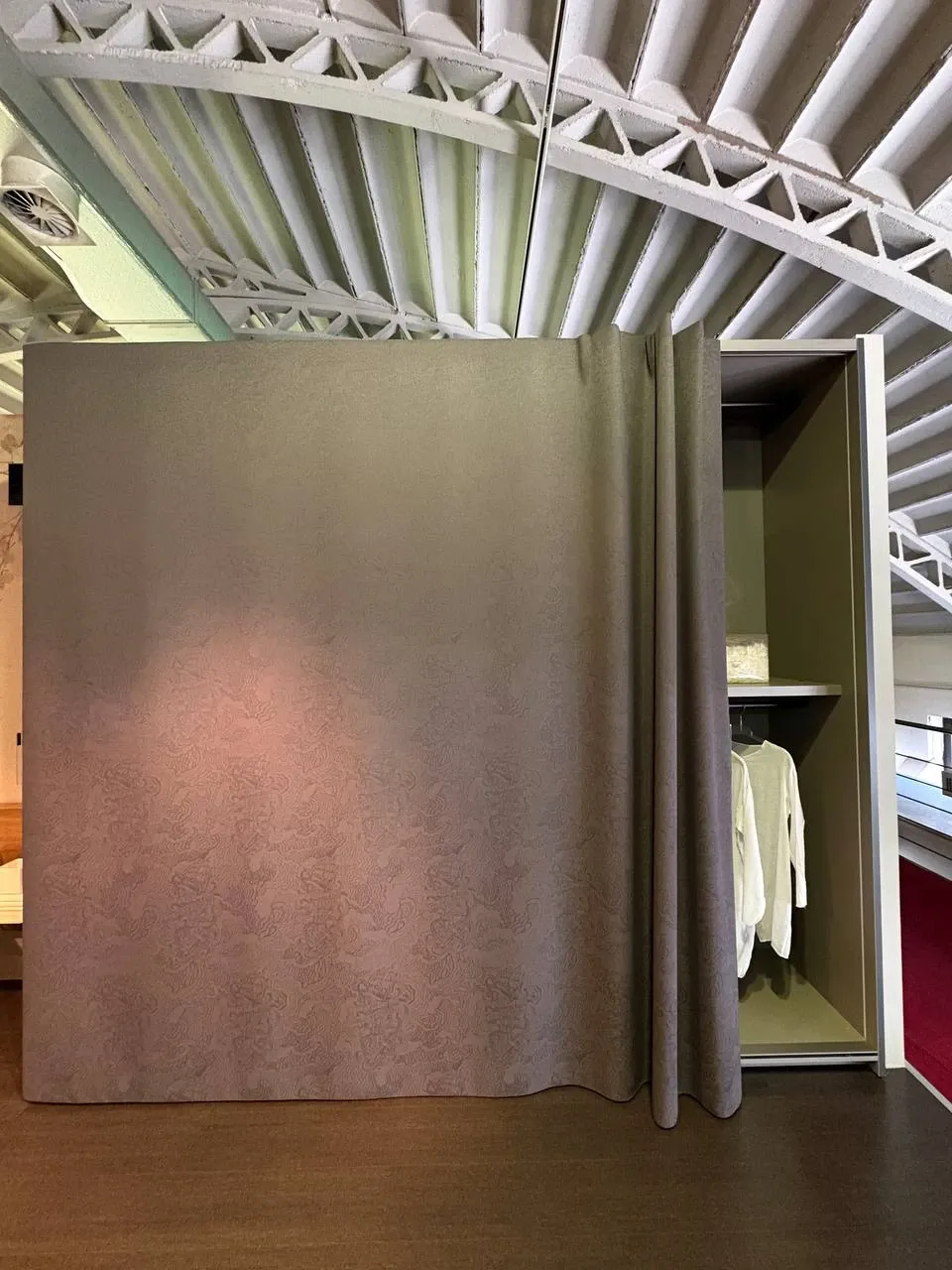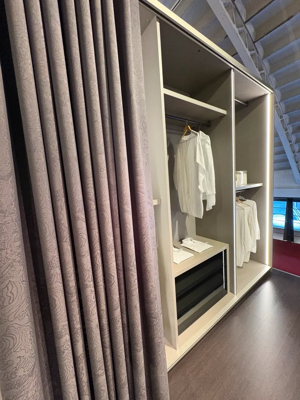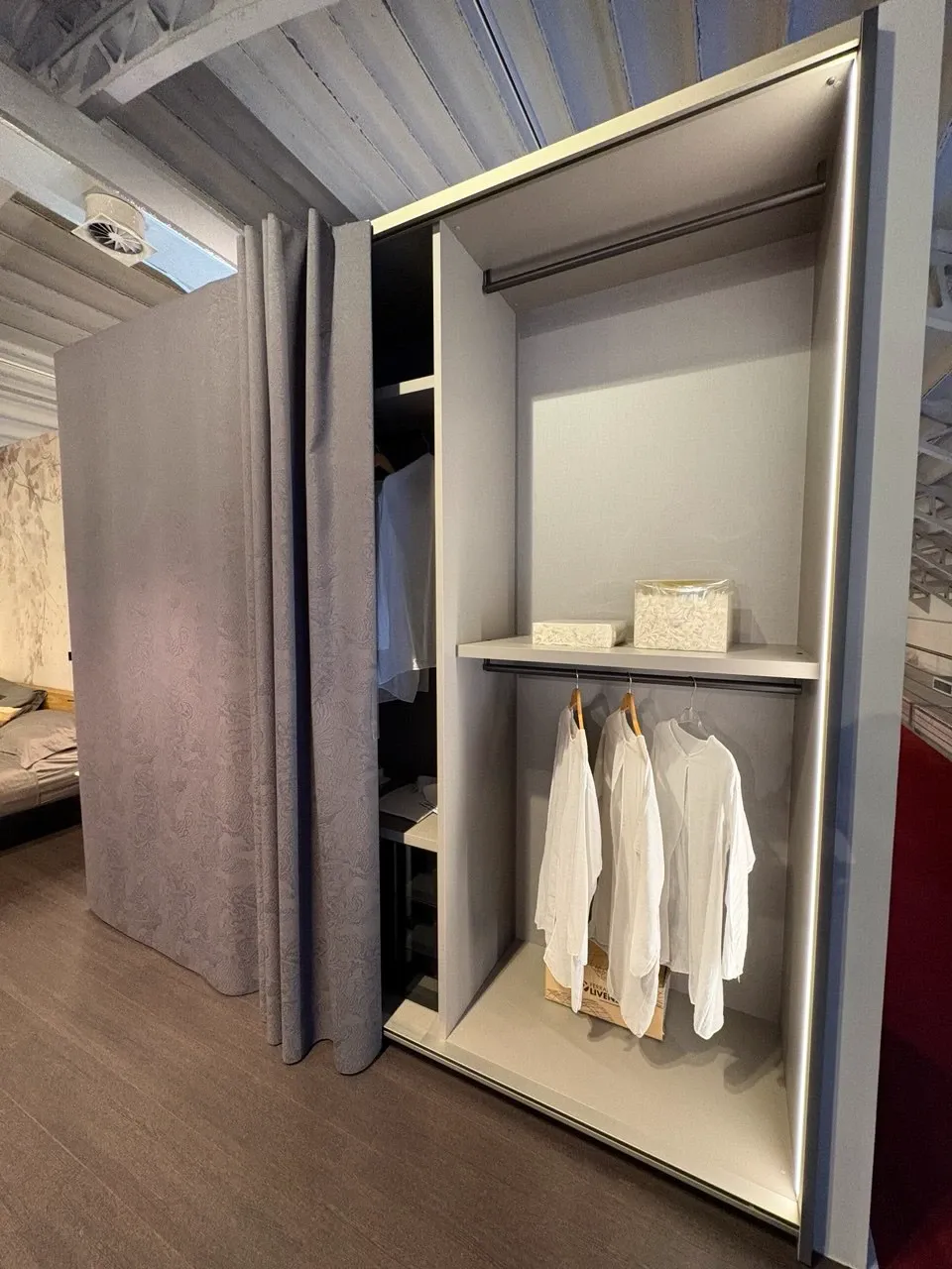 L'armadio scorrevole Lago ET VOILA' rappresenta un connubio perfetto tra design innovativo e funzionalitą. La sua caratteristica distintiva č l'anta scorrevole realizzata in una raffinata tenda di tessuto con finitura bomber Tatoo Dark, che conferisce un tocco di eleganza e modernitą all'ambiente. Questo dettaglio non solo arricchisce l'estetica, ma offre anche una soluzione pratica per ottimizzare lo spazio.