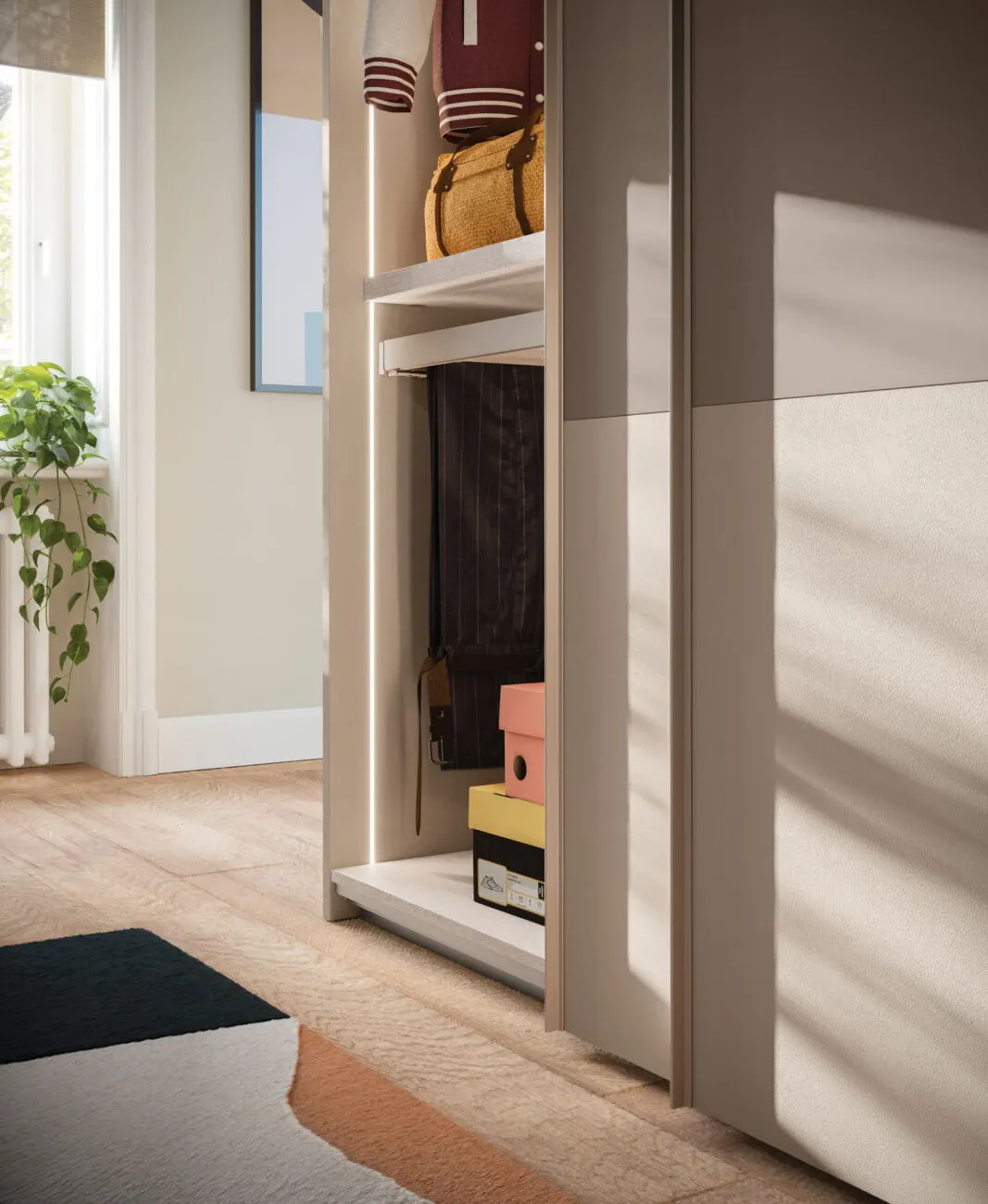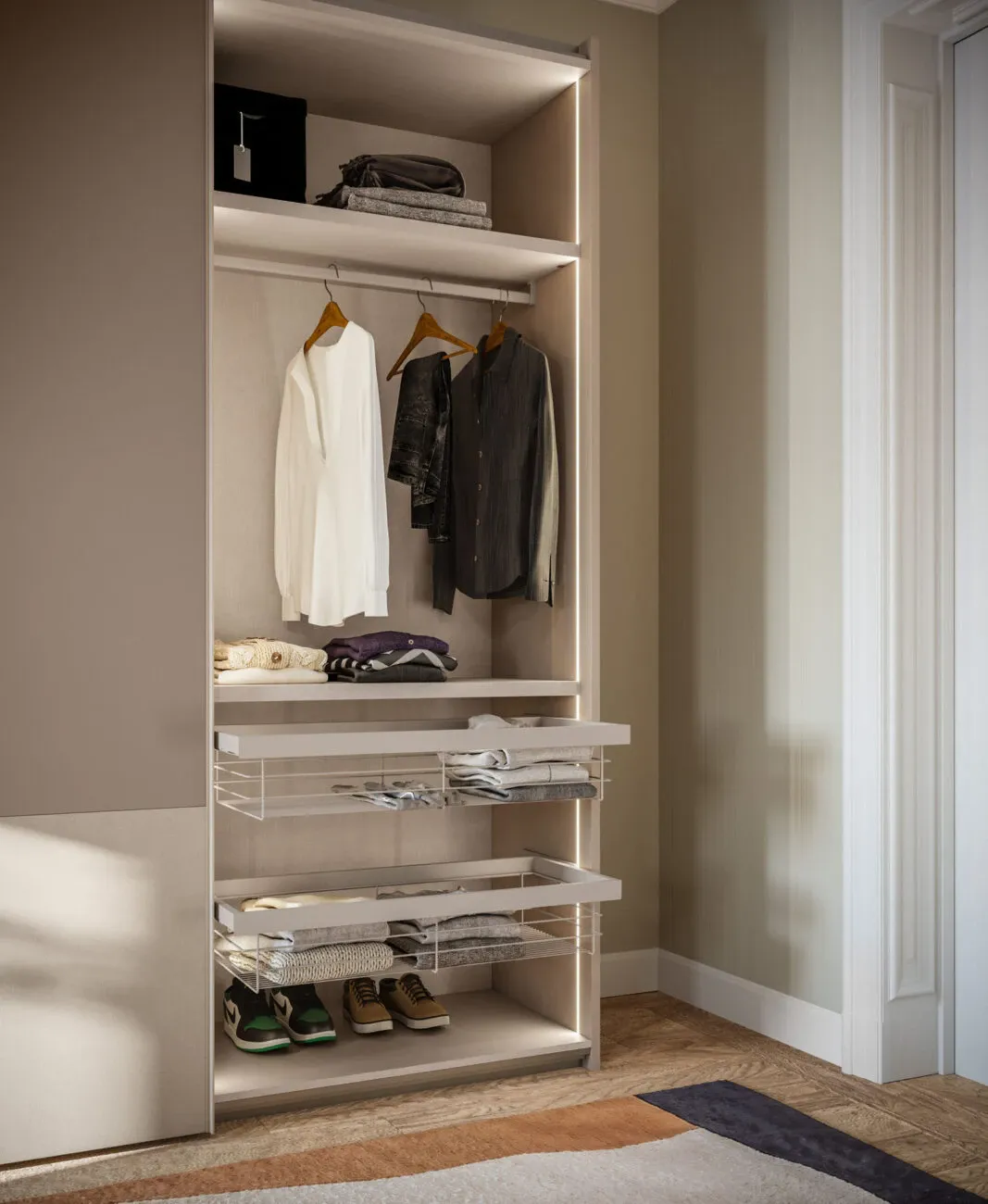 Attrezzatura interna composta da Alveare, cassettiera, portapantaloni estraibile e luci LED verticali.