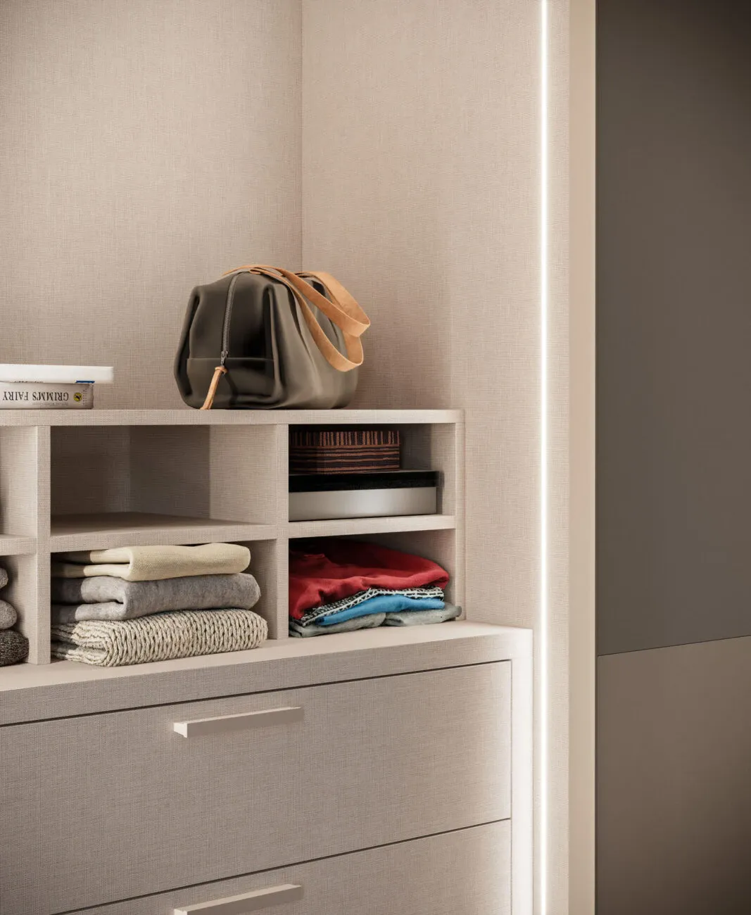 Colonna armadio attrezzata con tubo, Alveare, cassettiera interna e luci LED verticali. Colonna armadio attrezzata con ripiani, tubo, cestelli estraibili e luci LED verticali.