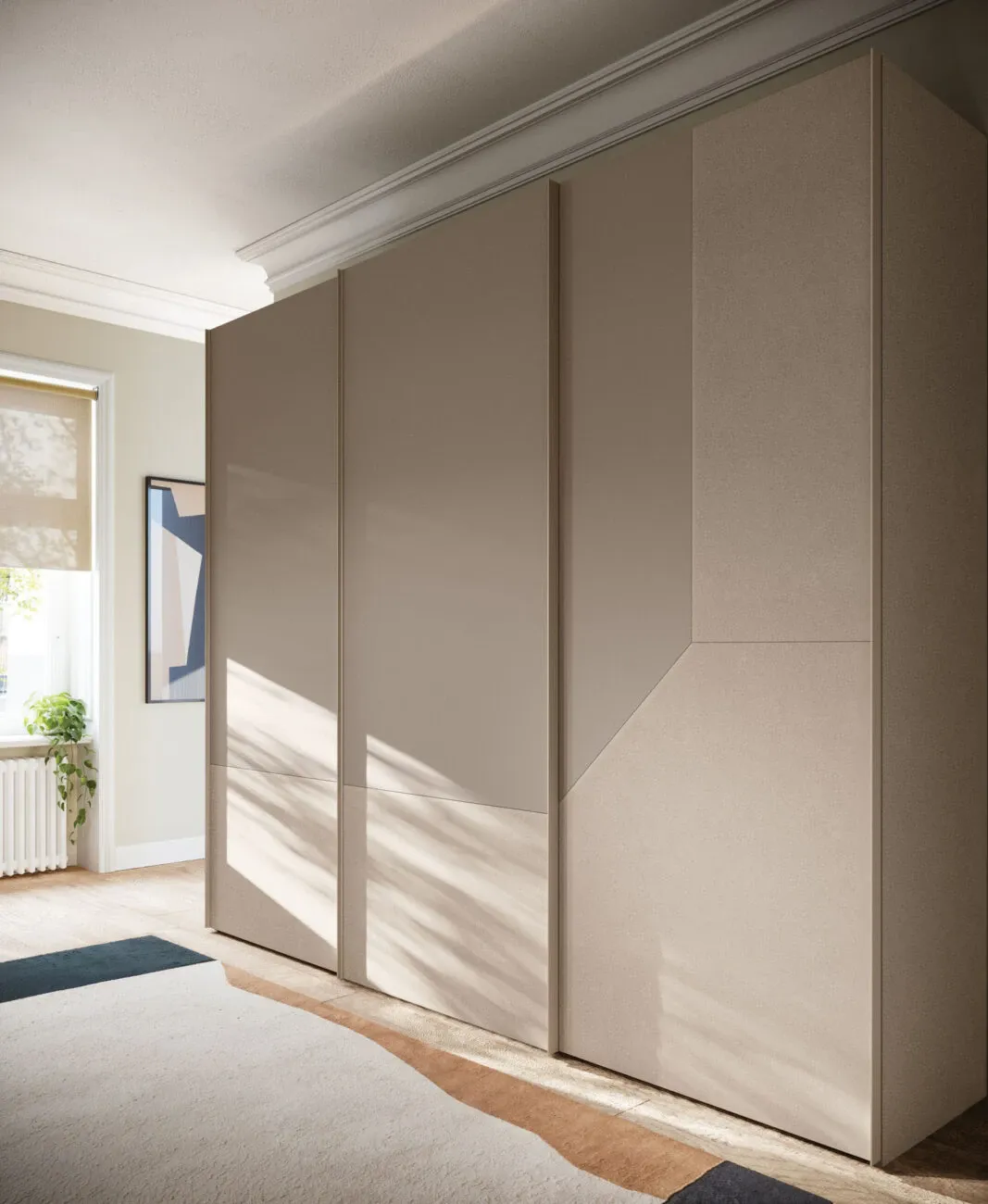 Armadio scorrevole Climb DN e Level DN in Platino e Cemento Aragona. Struttura interna in Cotone.