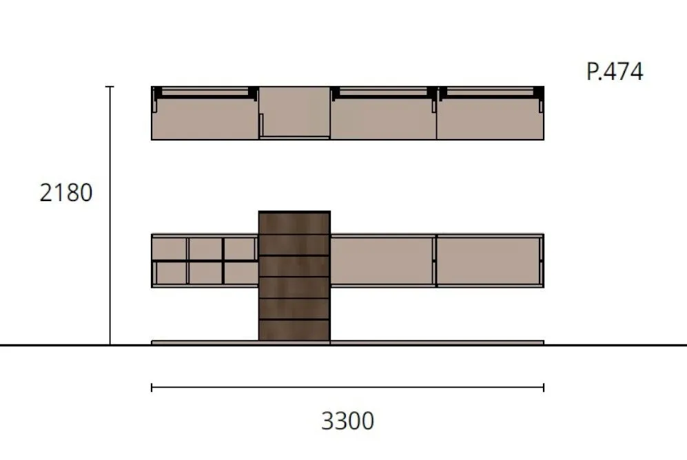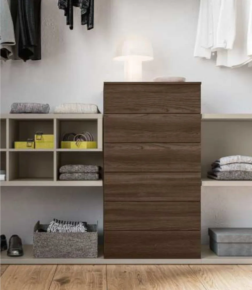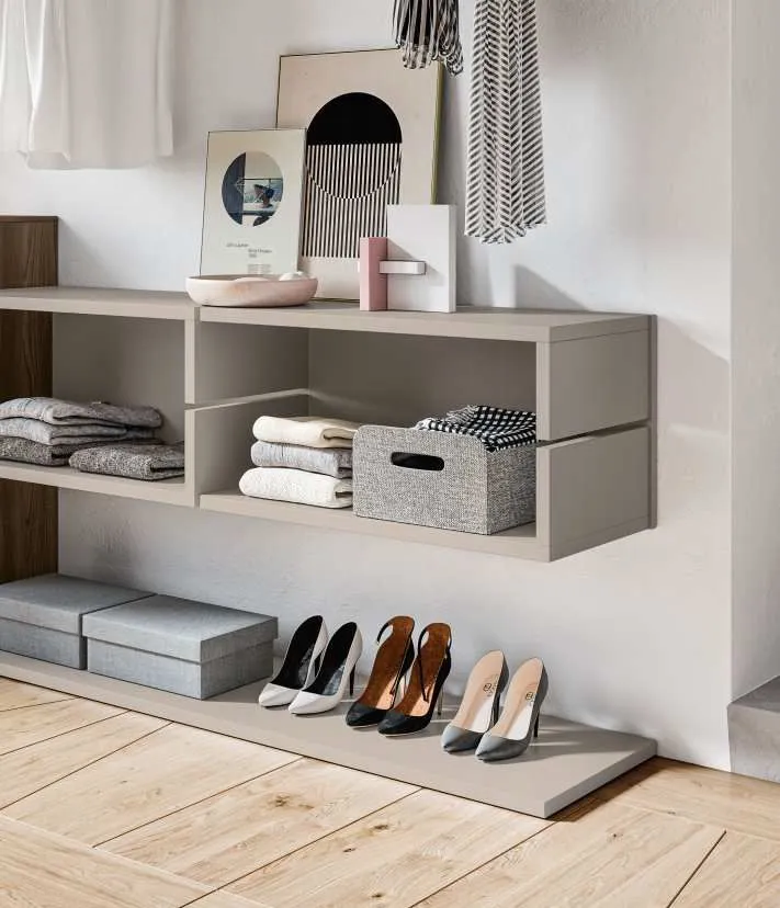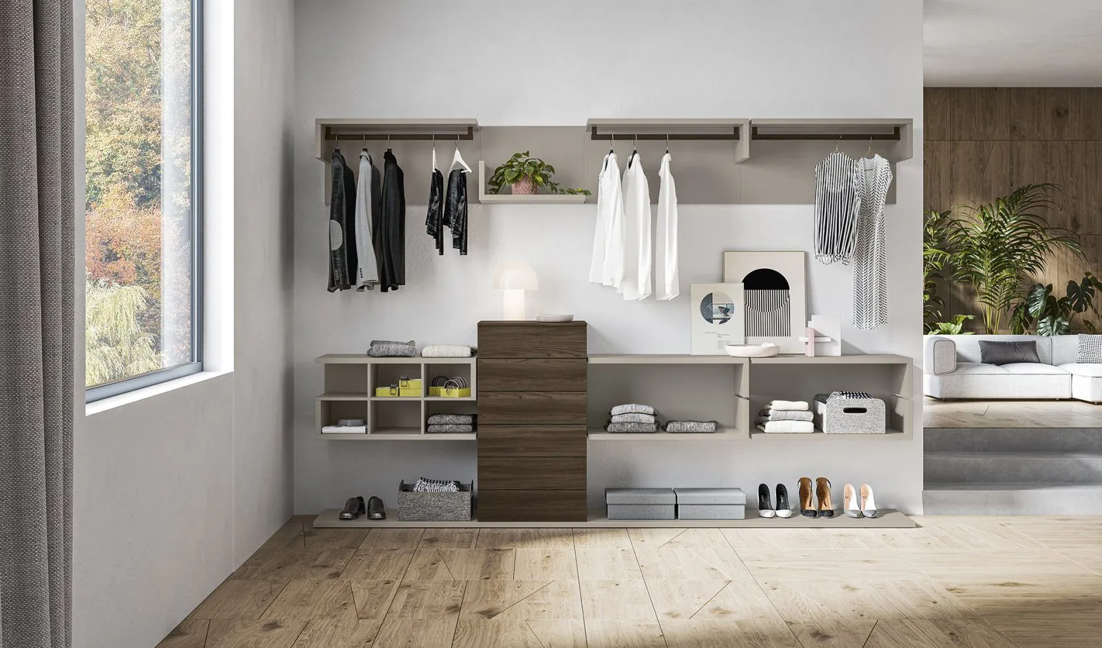 La cabina Combi è il massimo della personalizzazione perché puoi scegliere tra tanti elementi che si combinano tra loro. Qui mensole a "L" applicate a muro, danno vita ad elementi a giorno e si combinano con un pratico settimanale. MISURE: 330 x 218h