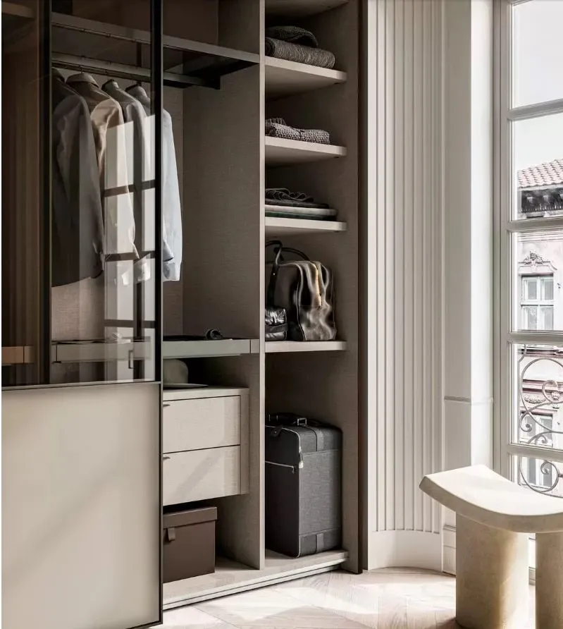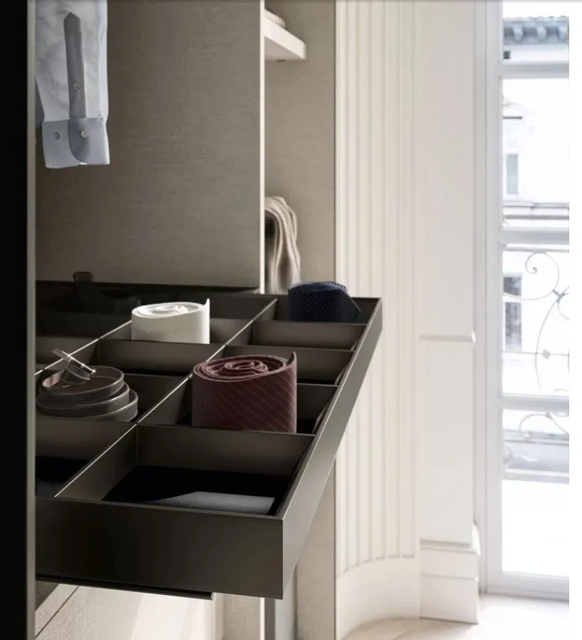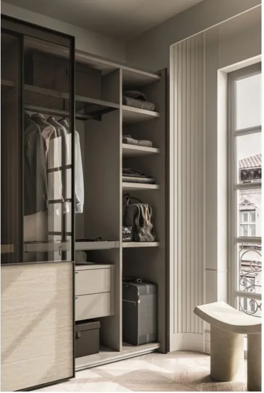 Dotazione di serie: 1 ripiano strutturale Sp. 35 mm + 2 tubi appendiabiti finitura Titanio per vano