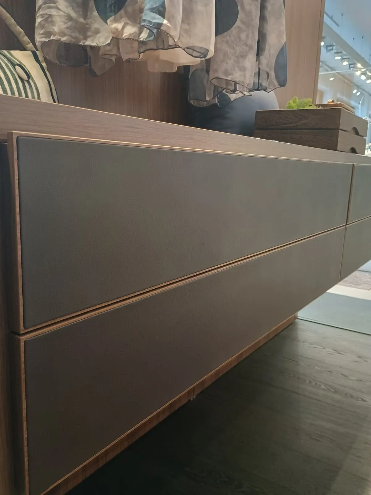 Lunghezza totale schienali 226 x h 258 cm, Lunghezza cassettiera 225 x h 40 x p 53, dettaglio frontale cassetto in ecopelle.