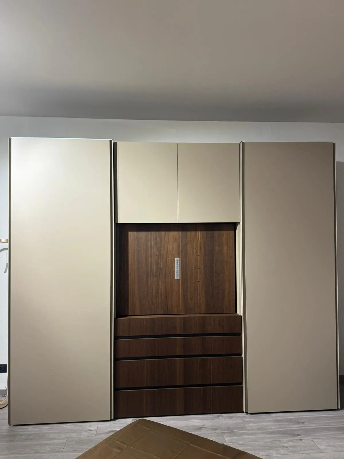 ARMADIO SANGIACOMO ODEON CON PORTA TV CONTENITORE. L302,5XH255,6. 2 ANTE SCORREVOLI CON GOLA METALLICA LACCATA. FINITURE: ANTE IN LACCATO OPACO COLORE OMBRA E CASSETTI CON MODULO TV IN ESSENZA IMPIALLACCIATA COLORE ROVERE TERMOTRATTATO. PRESENTA DI SERIE 4 APPENSIABITI E 2 RIPIANI