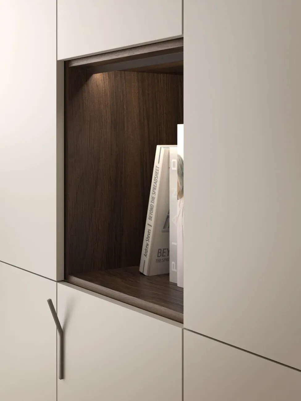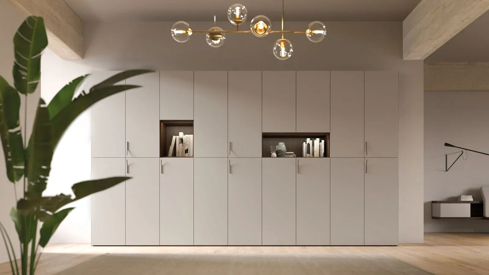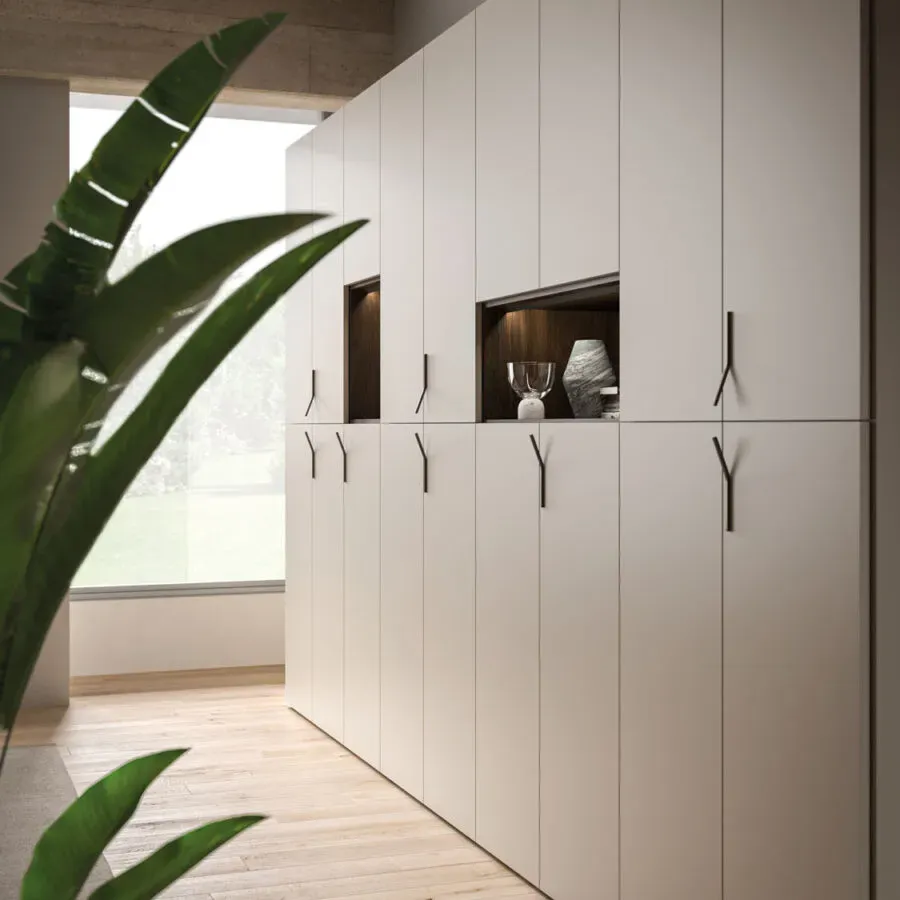 Interno Cotto, ante in laccato opaco Sabbia con maniglie in metallo brunito.