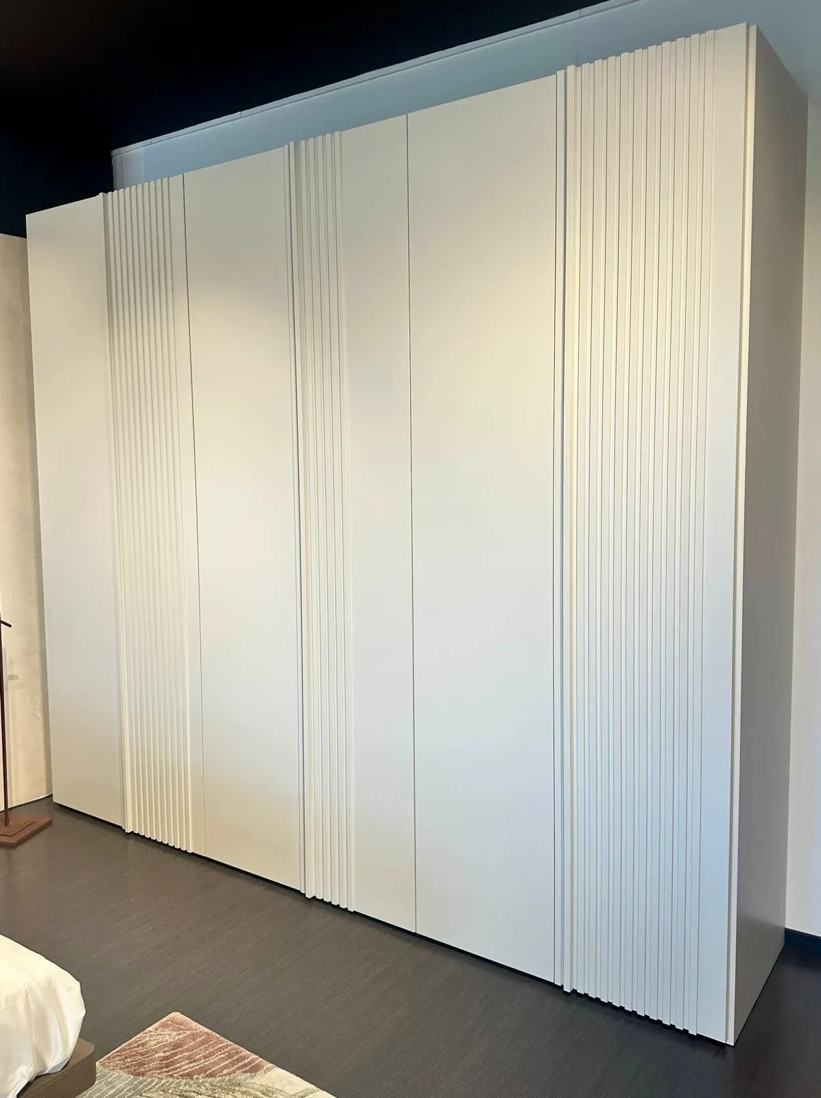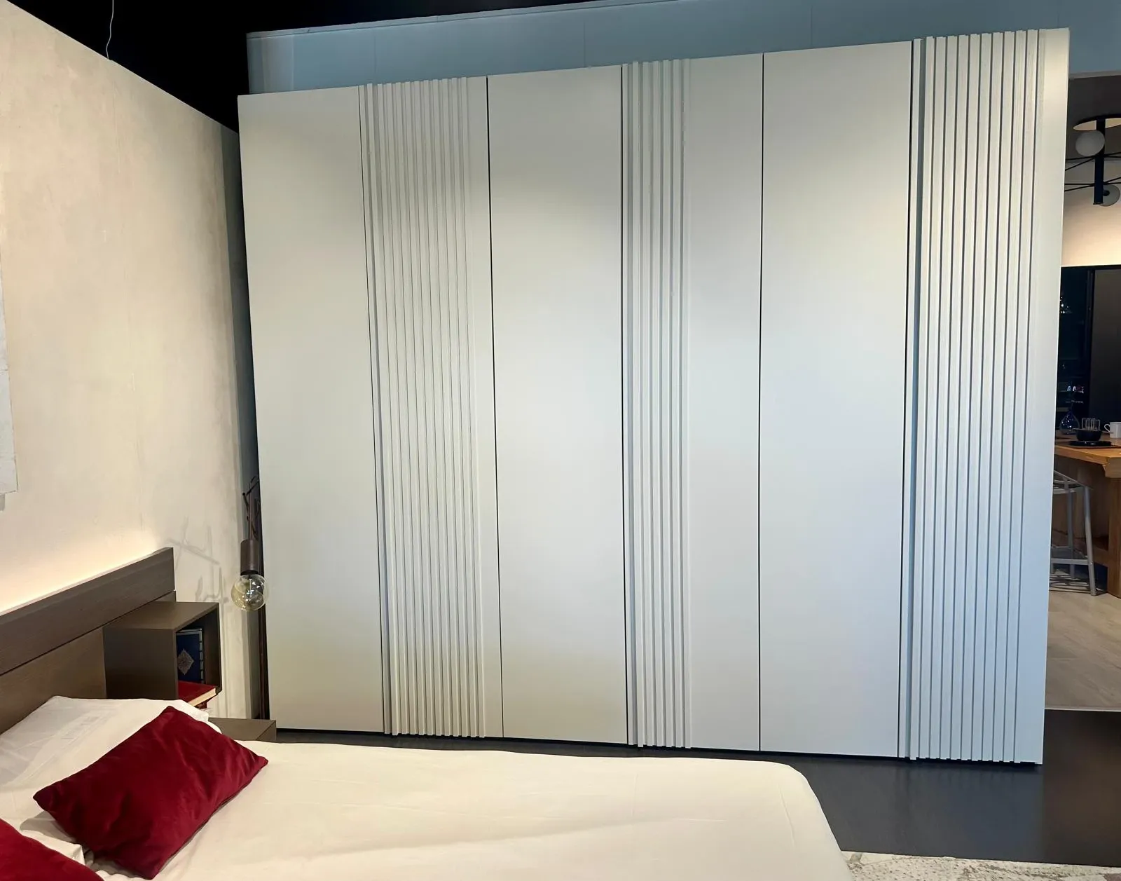 Vela di Mobilgam č un armadio 6 ante battenti in finitura laccato opaco avorio e le doghe sono in frassino laccato avorio.