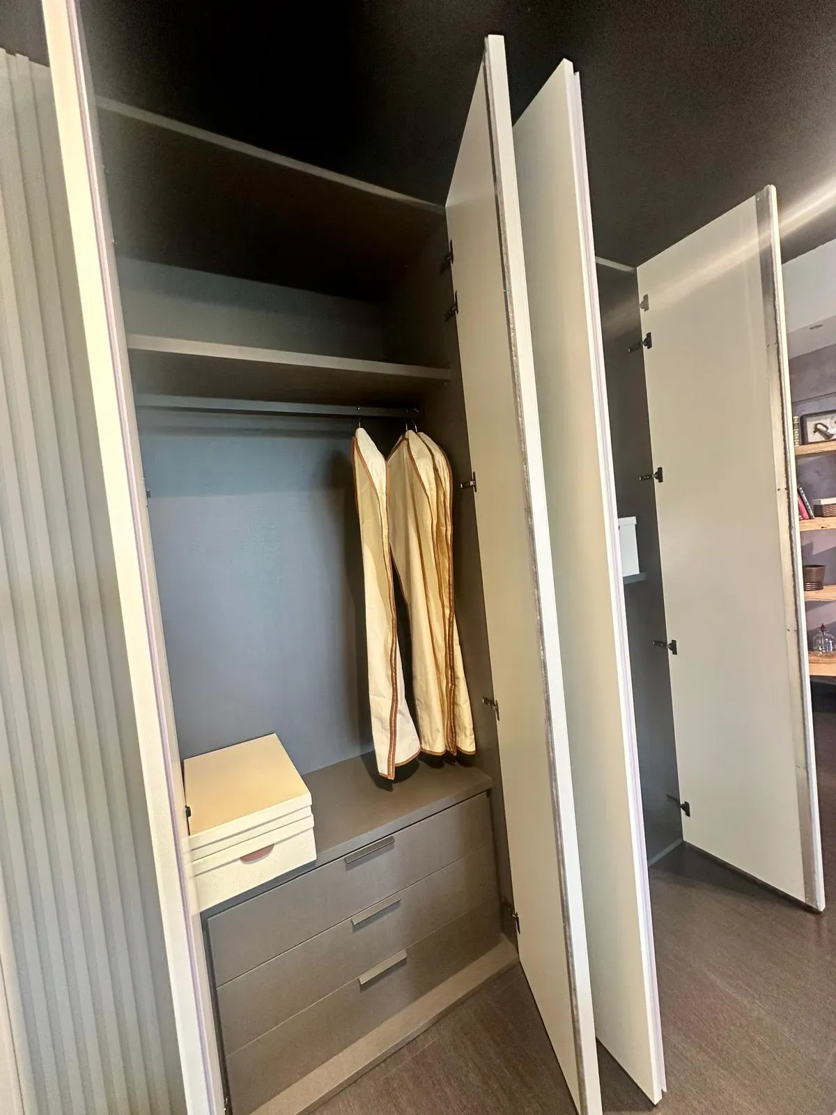 Ogni materiale deve essere scelto appositamente per il tipo di mobile che andrā a costituire, in quanto ha peculiari connotazioni di praticitā ed estetica: l'armadio Riga č realizzato in laccato opaco.