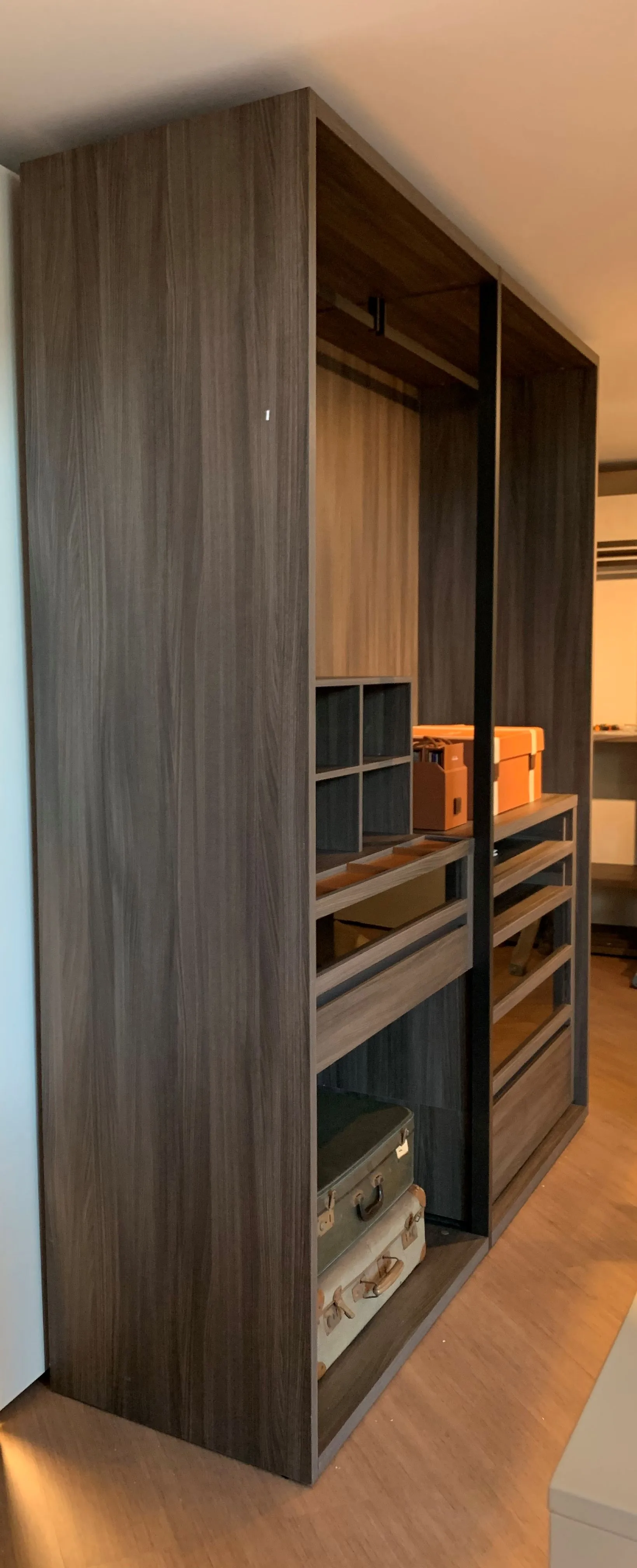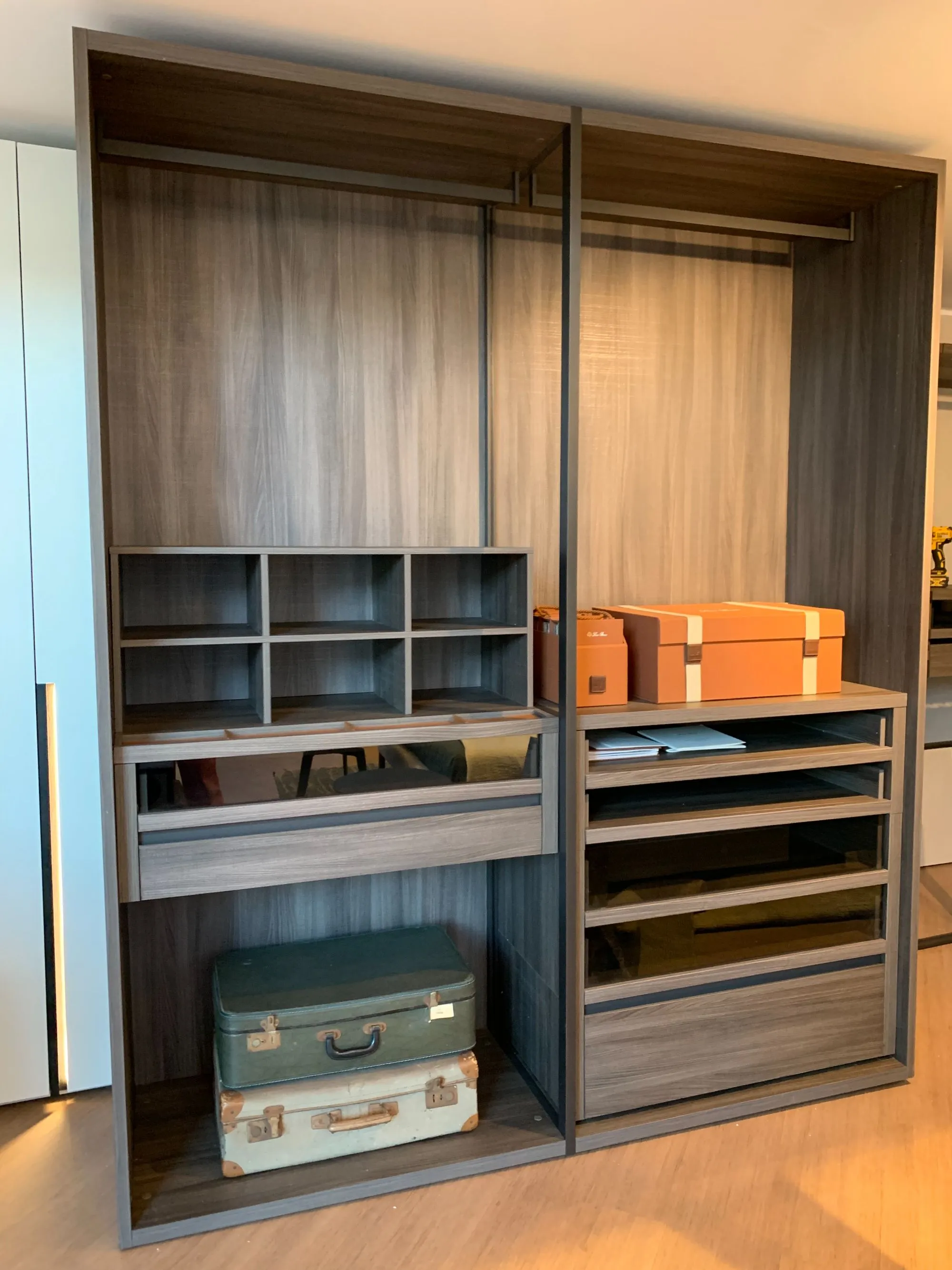 La cabina armadio Bellavista č formata da due moduli da 97,5 cm l'uno, con fianchi in olmo materico scuro e divisorio a telaio brown. E' possibile gestire al meglio lo spazio grazie agli accessori interni, come il separatore con svuotatasche a folding con divisorio in pelle e il portapantaloni sospeso. La cabina č dotata di ripiani estraibili e cassetti con frontale in materico olmo, con apertura gola brown, e frontali in vetro extrachiaro. I due tubi appendiabiti, nella stessa finitura del telaio e dei dettagli, permettono di sfruttare la cabina in tutta la sua altezza.