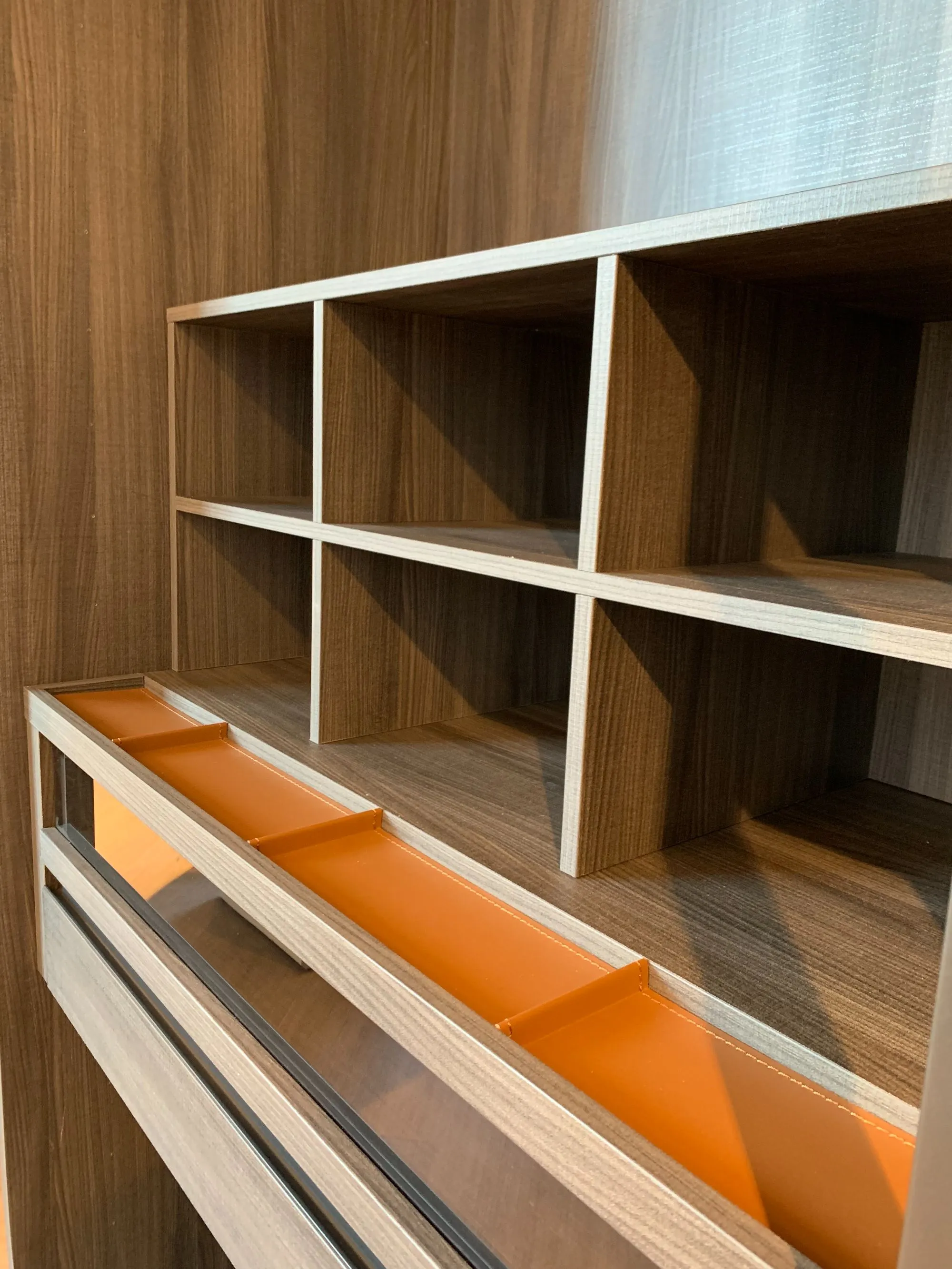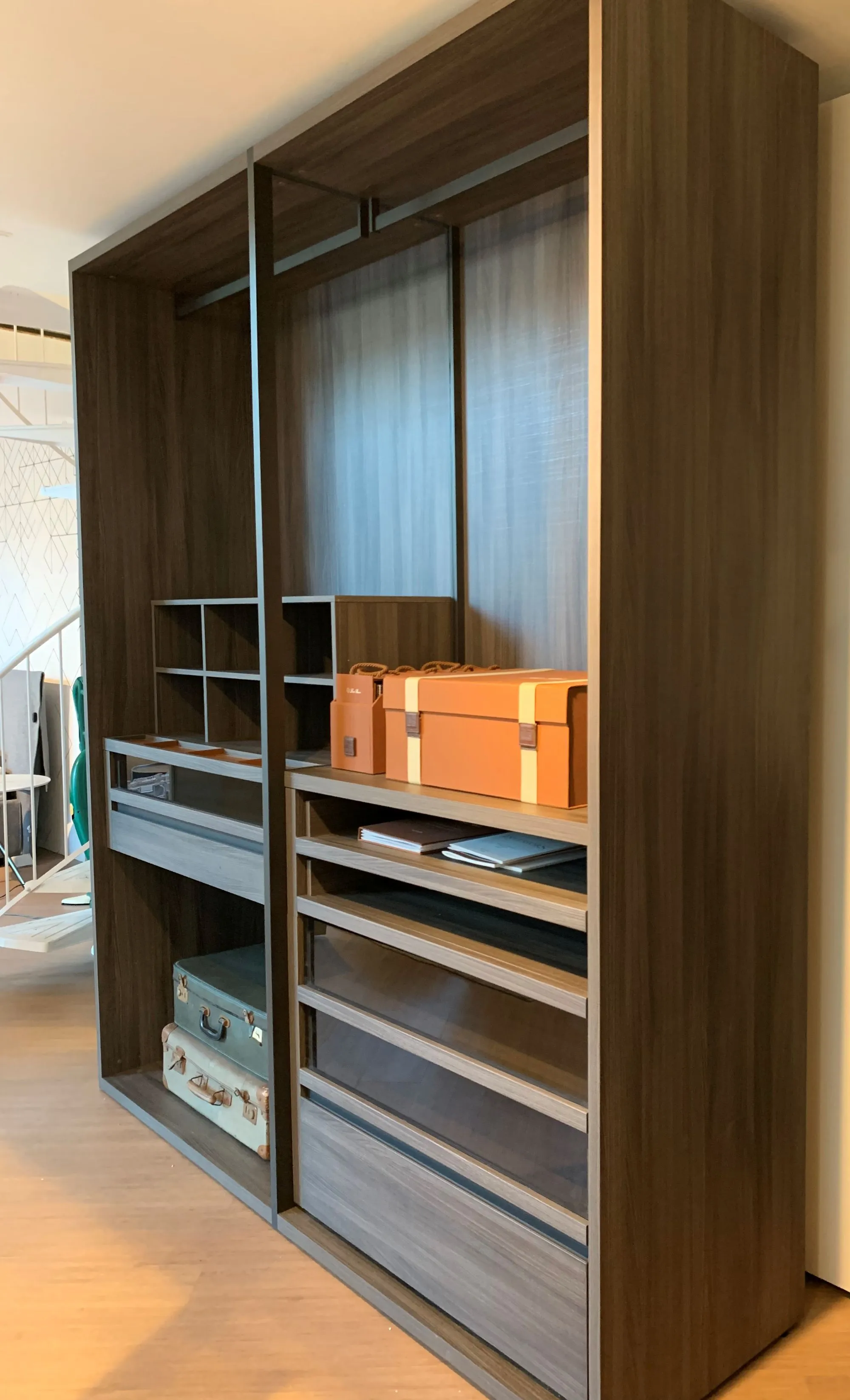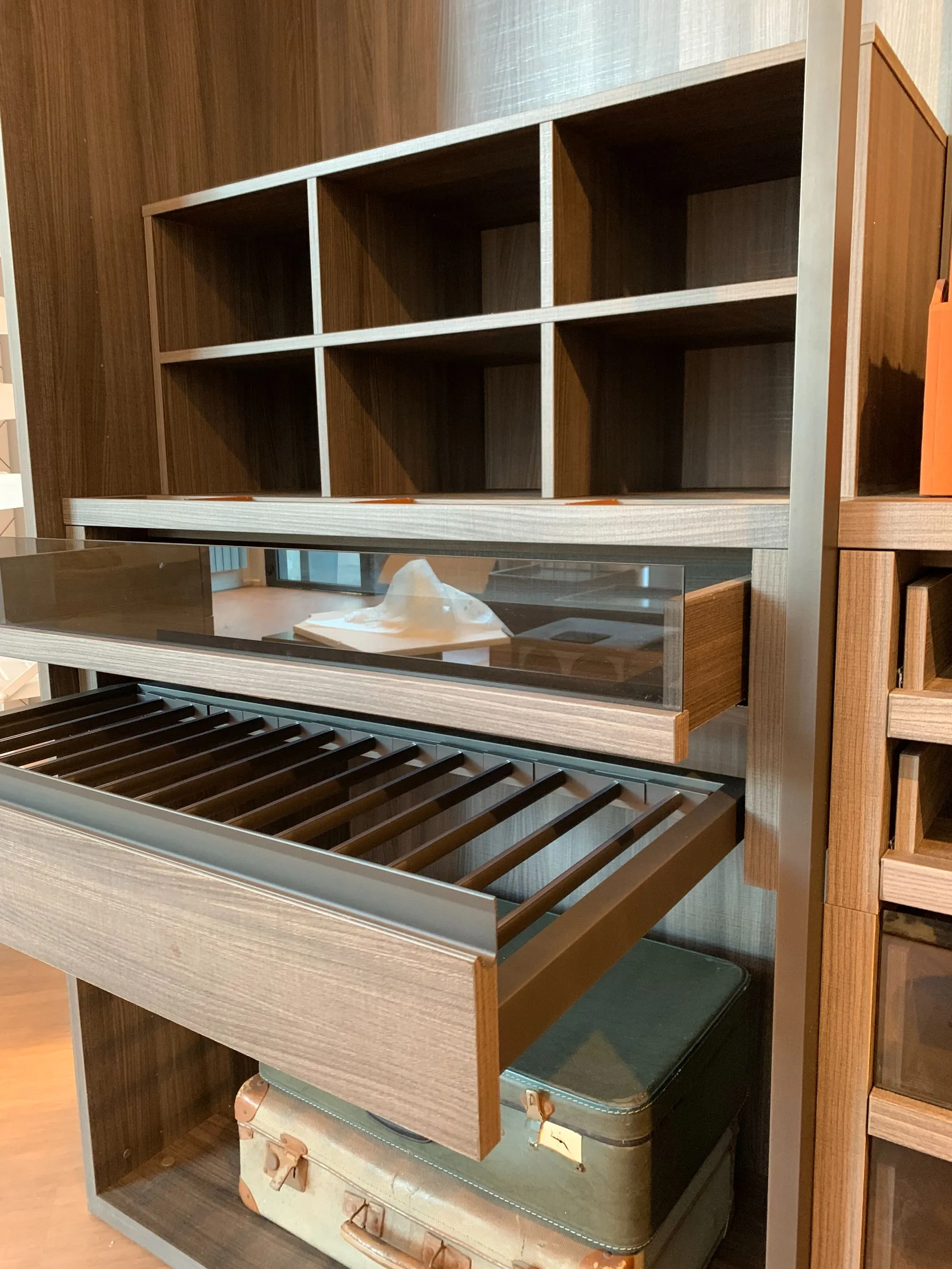 Uno spazio dove l'eleganza si mette in bella mostra, grazie a soluzioni espositive, pratici accessori e sistemi di organizzazione, insieme alle venature del legno ed al riflesso dei vetri, creano un'affascinante atmosfera.