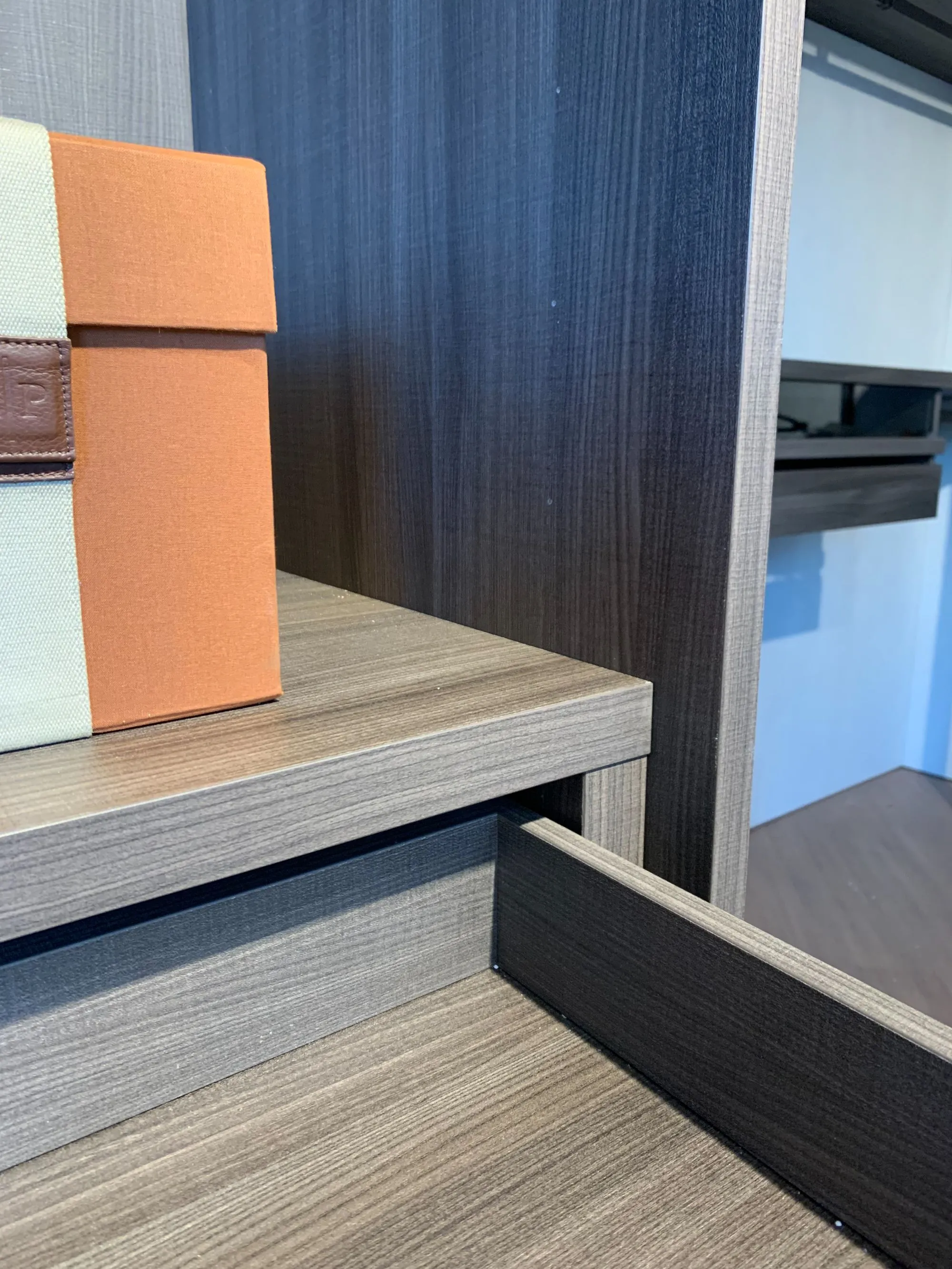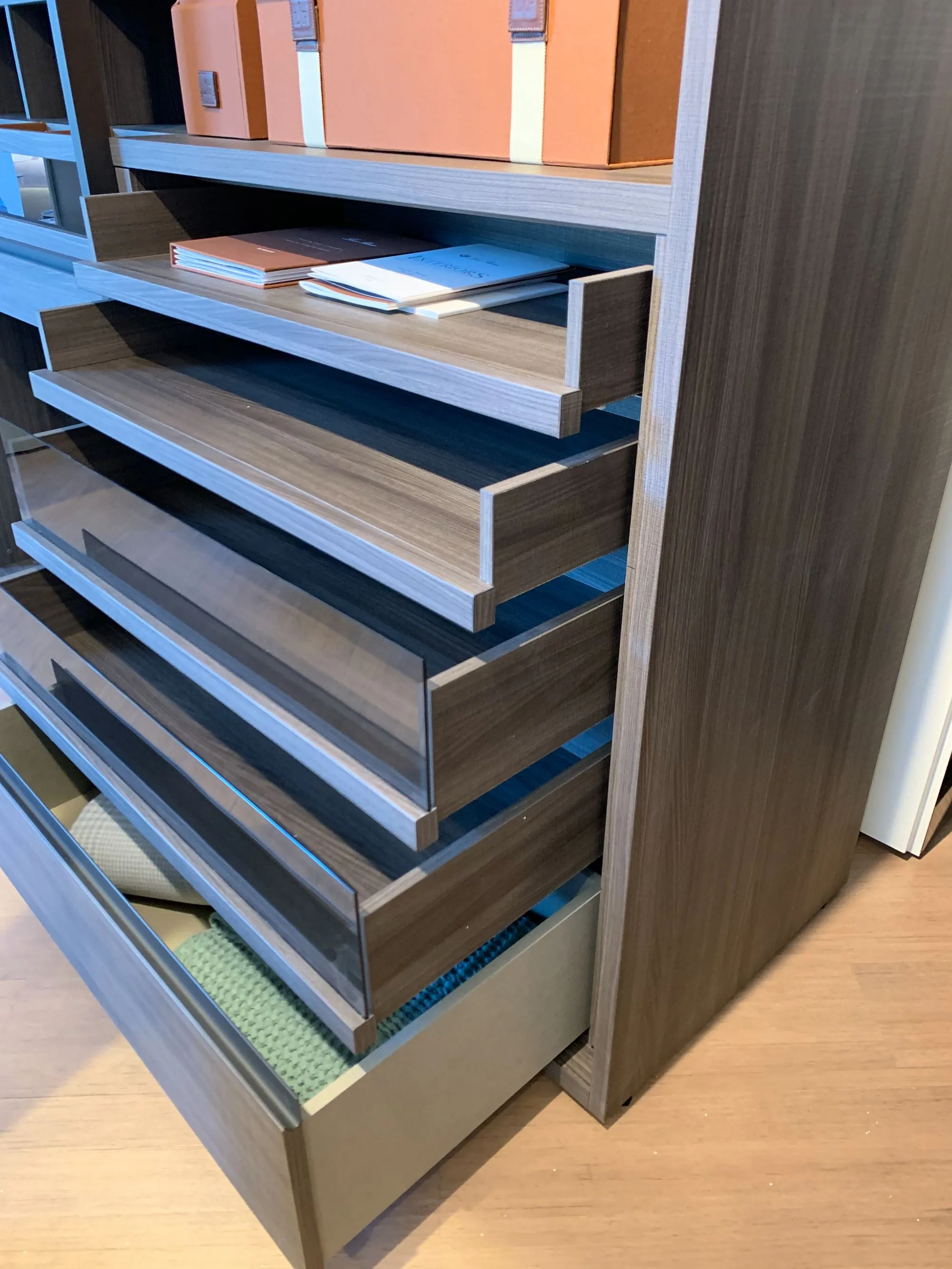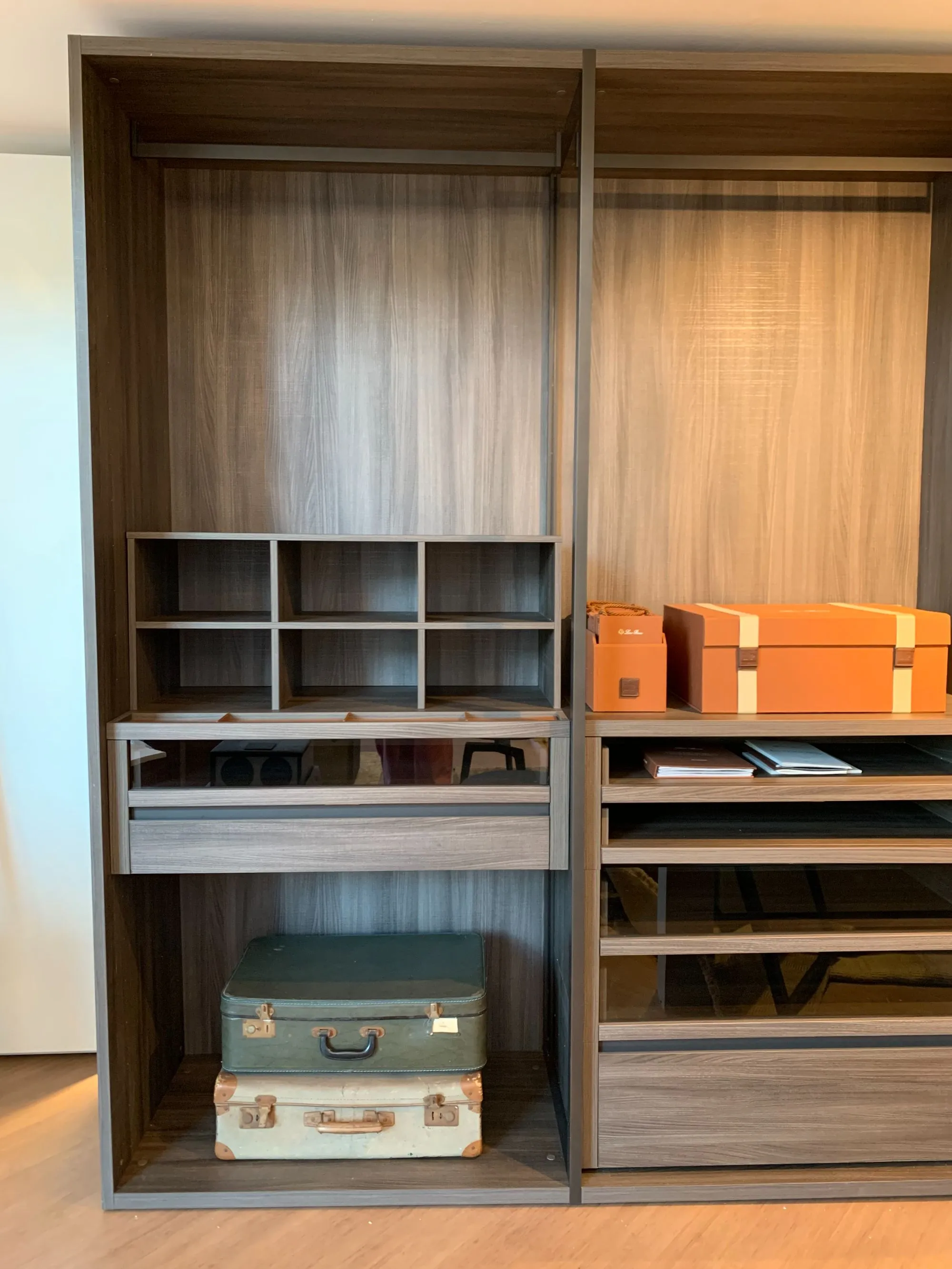 Uno spazio dove l'eleganza si mette in bella mostra, grazie a soluzioni espositive, pratici accessori e sistemi di organizzazione, insieme alle venature del legno ed al riflesso dei vetri, creano un'affascinante atmosfera.