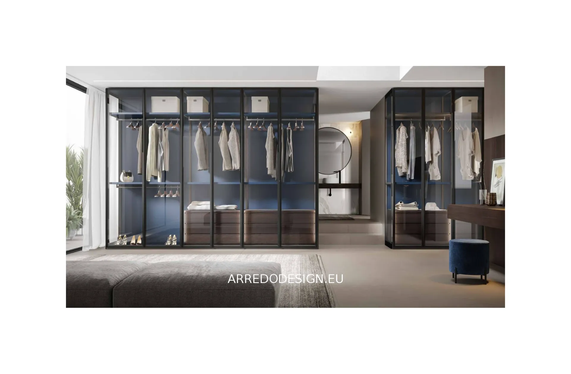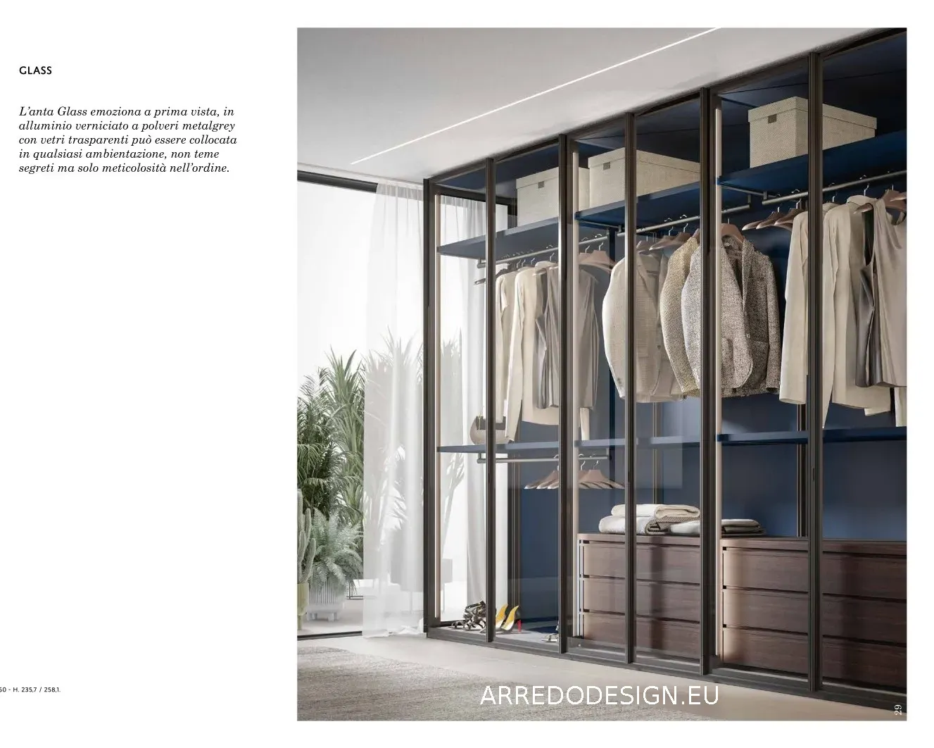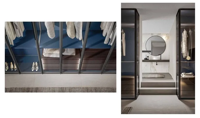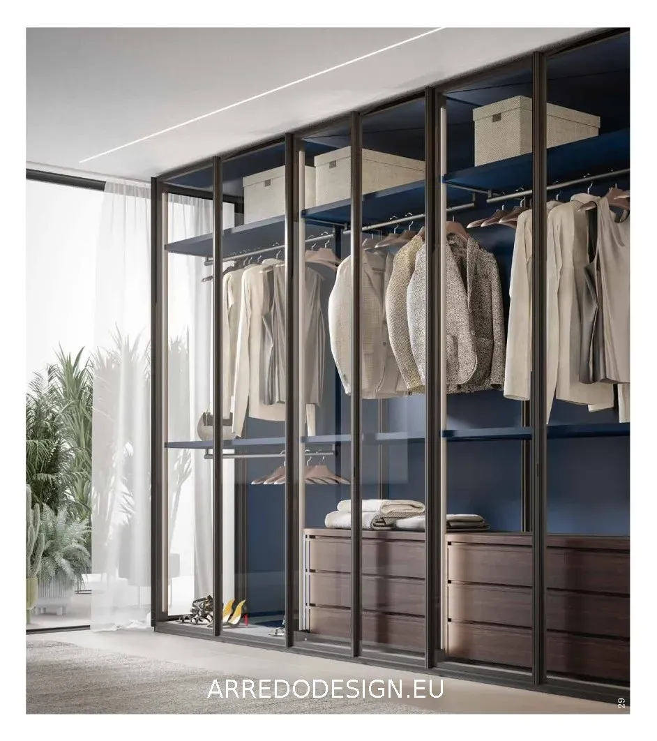Il design è definito dalla trasparenza delle ante, che trasformano l'armadio in una vetrina scenografica. La particolare struttura interna senza divisioni permette alla luce di fluire liberamente, ampliando visivamente i volumi della zona notte e conferendo un senso di estrema leggerezza.