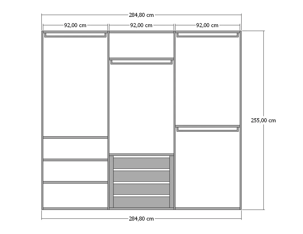 Dimensioni Armadio: cm L. 284,8 x H. 255 x P. 62,3
