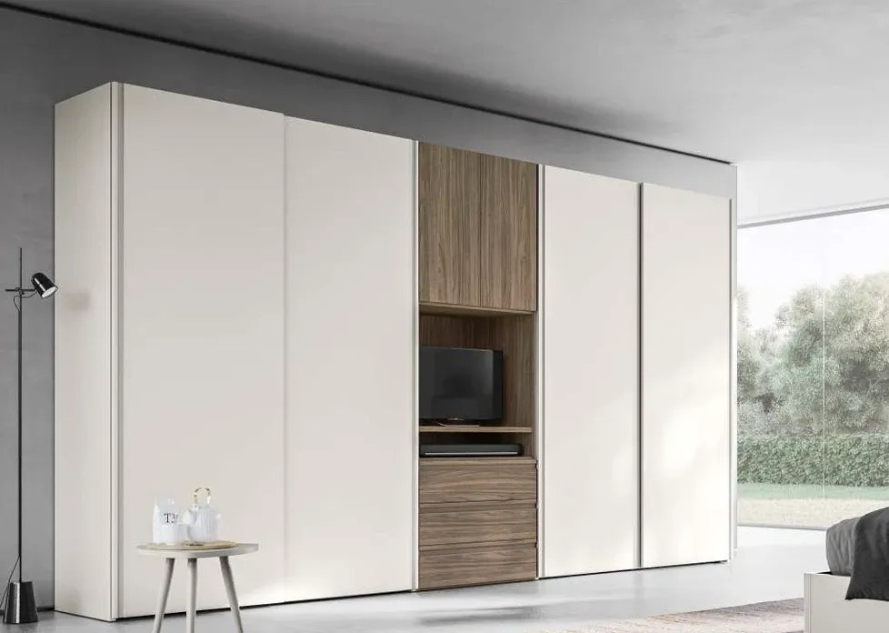 Le sue ante scorrevoli fluide e l elegante elemento TV centrale con cassettiera integrata lo rendono la soluzione perfetta per arredare la zona notte o una moderna camera living con un unica struttura armoniosa e d impatto.