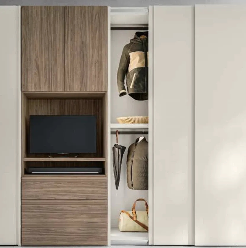 Contattaci o compila il form online per creare il tuo armadio scorrevole moderno con vano TV, realizzato su misura per te.