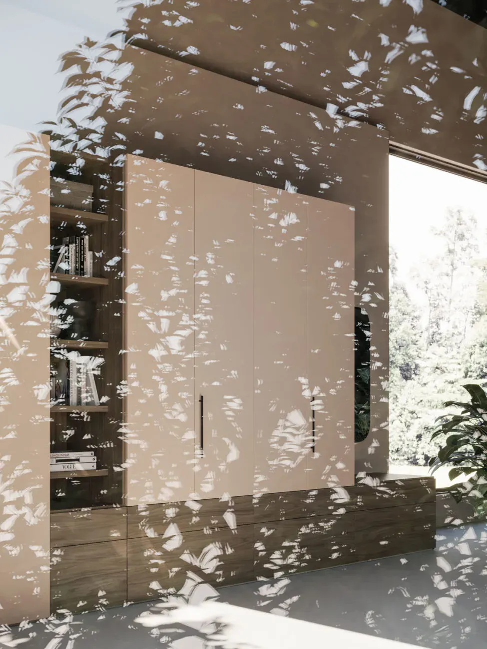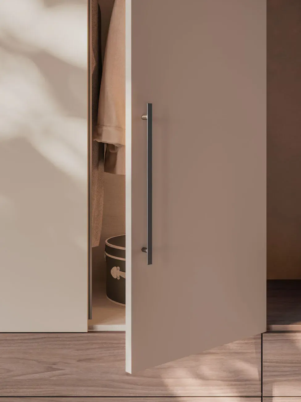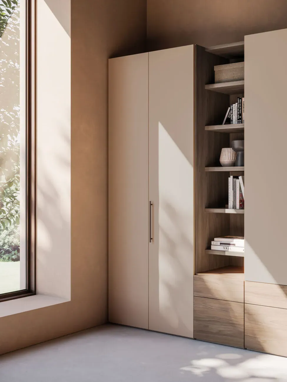 Armadio battente con anta Liscia e maniglia L15. Interno in Cotone, ante in laccato opaco Ecrù, cassetti ed elemento a giorno in materico Noce. Maniglia L15 in metallo brunito.