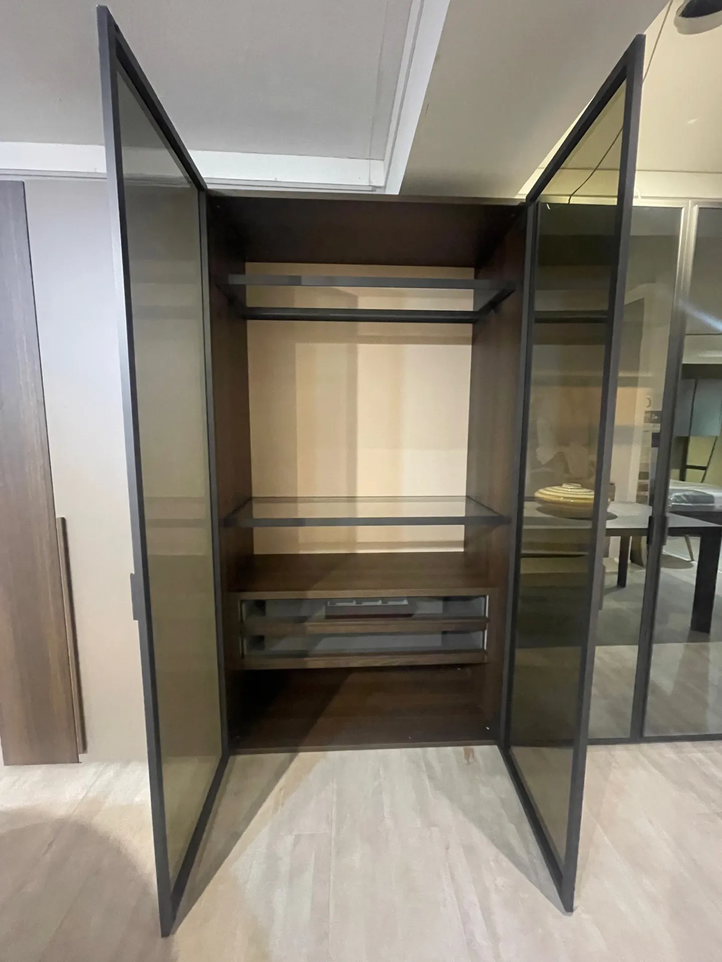 Armadio Febal L .425 h 225,6 p.60 frontali nobilitato opaco eucalipto e basalto e ante centrali in vetro fumè con telaio nero.