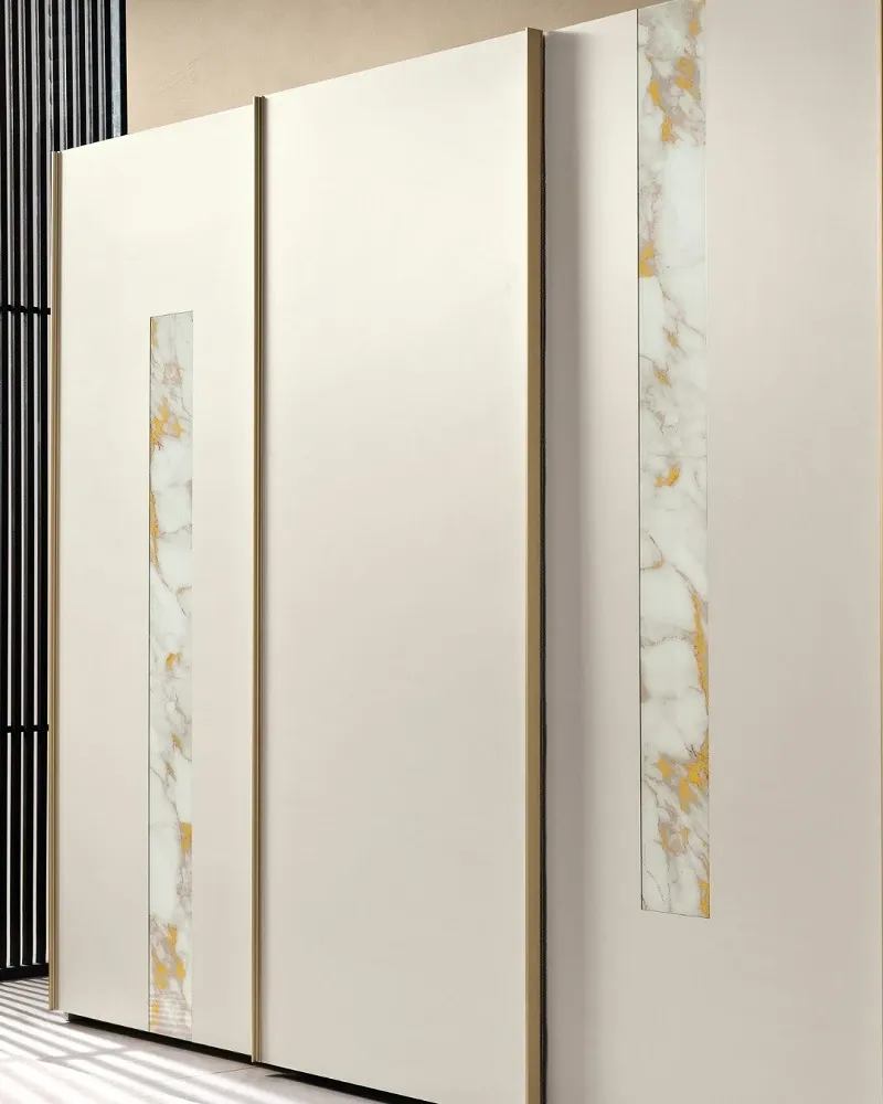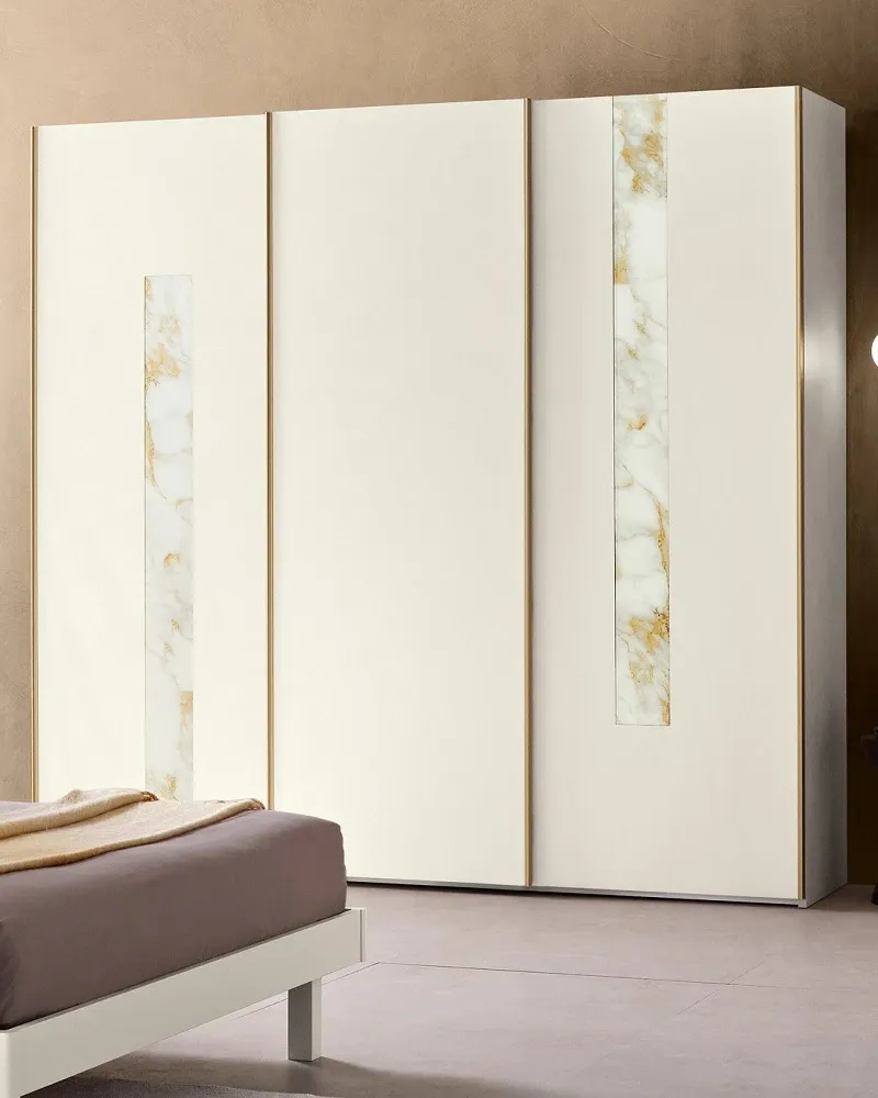 Armadio a 3 ante scorrevoli,proposto nella versione in Nobilitato Bianco opaco,con inserti laterali in vetro Calacatta gold e maniglioni verticali nella finitura Oro. Le sue dimensioni esterne d'ingombro sono di: cm.271,1 lunghezza x cm.65 profondità esterna x cm.256 altezza di serie. E' completo di chiusure ammortizzate di serie. E' disponibile nei diversi colori e finiture a scelta del campionario. Viene prodotto con materiali di alta qualità,con l'impiego esclusivo di pannelli ecologici classe E1 . La struttura interna,completa di ripiani-mobili spessore mm.30 con tubi-appendiabiti in metallo finitura: Ossido, con cassettiera interna a 3 cassetti,viene prevista nella finitura: Madreperla(effetto tessuto grigio chiaro). Il prezzo-promo è compreso del trasporto e del montaggio in tutte le Regioni d'Italia. Per qualsiasi informazione,potete contattarci attraverso il nostro indirizzo di posta elettronica.