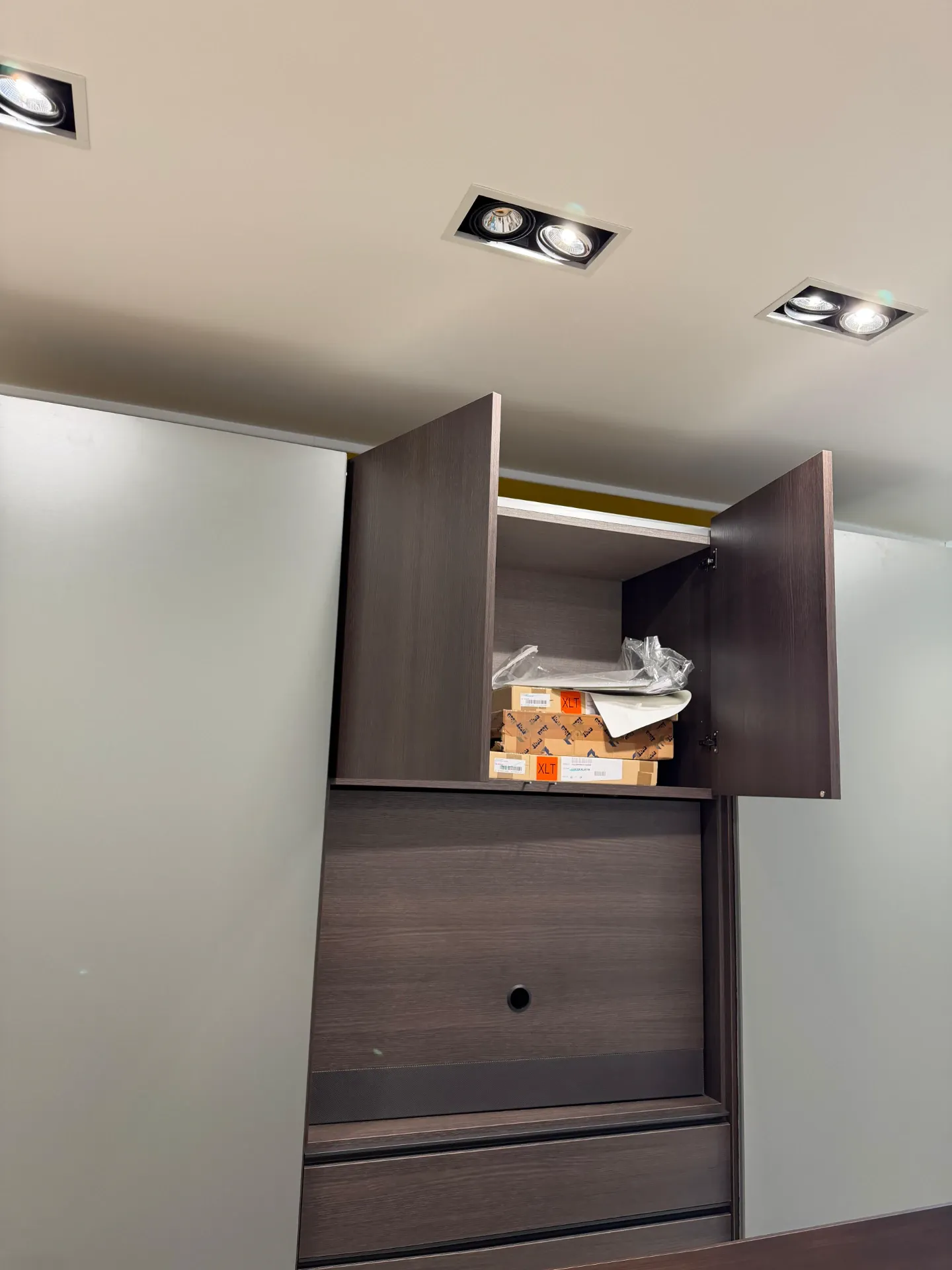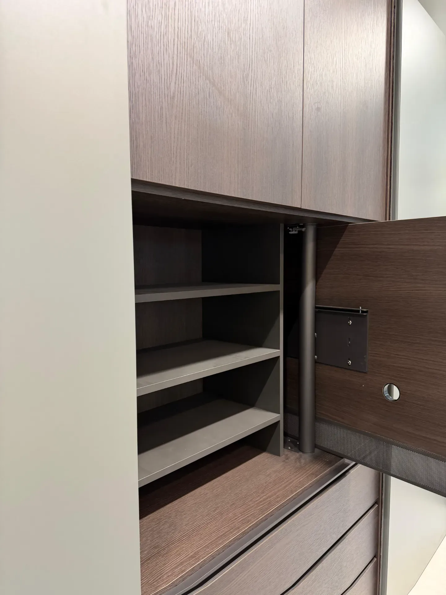 Dettagli: Armadio scorrevole con porta tv scorrevole integrato, Finitura noce ambra e Basalto