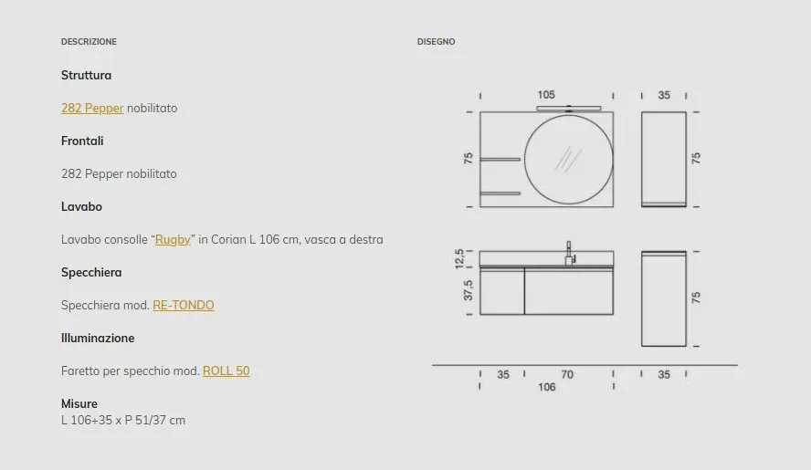 - Il laminato di grande qualità selezionato e lavorato con cura per questo mobile bagno, assicura gli esiti sperati dal punto di vista della praticità, con un elevato contenuto estetico; questa soluzione è perfetta per essere inserita in locali di ogni tipo, resistendo negli anni all'azione di vapore acqueo e agenti chimici.