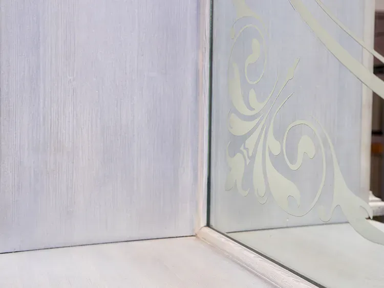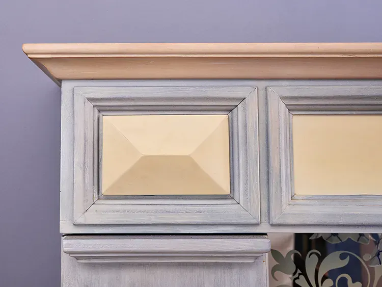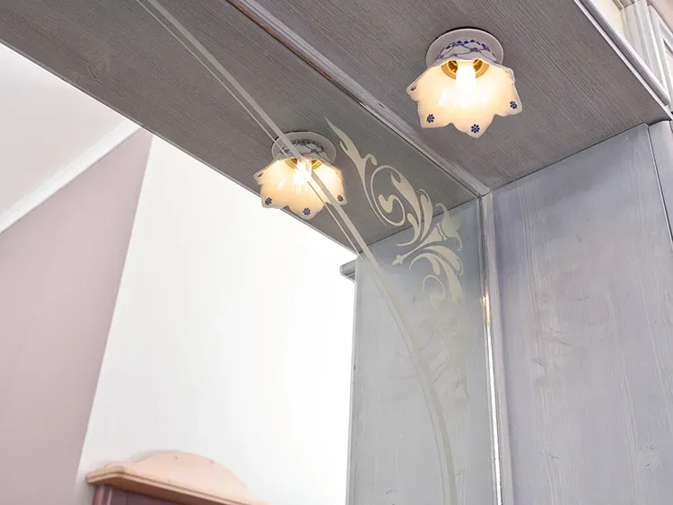Mobile da bagno con base composta da 4 ante e 2 cassetti in Abete massello verniciato ad acqua col Azzurro cielo, con finitura decapè Bianca patinata a mano, cornici e piedi in finitura naturale, Top e schienale in marmo cristallino azzurro sp. 3 cm, specchio con decorazione sabbiata sugli angoli con sotto 6 cassettini e 2 antine laterali, faretti da incasso in ceramica mangani