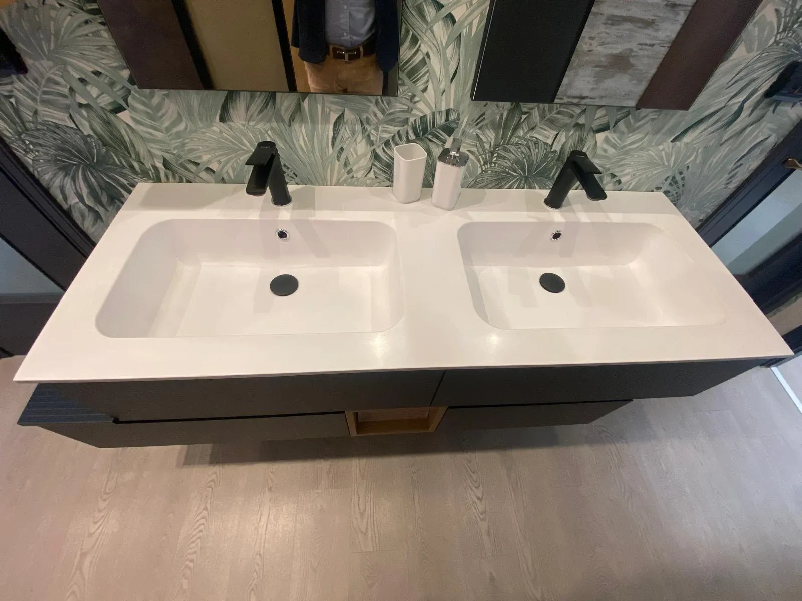 Mobile bagno sospeso Compab in laccato opaco finitura cannettata laos, con doppio lavabo integrato nel top in mineralguss, 2 rubinetti neri, 2 specchiere con faretto nero, pensile in laminato materico rovere. Misure : L.161 P.51 H.51 cm. IN OFFERTA OUTLET Euro 1400,00 VISIONABILE PREVIO APPUNTAMENTO NEL PUNTO VENDITA DI CASELLE T.SE IN VIA ALLE FABBRICHE 20 TEL. 0118170952.
