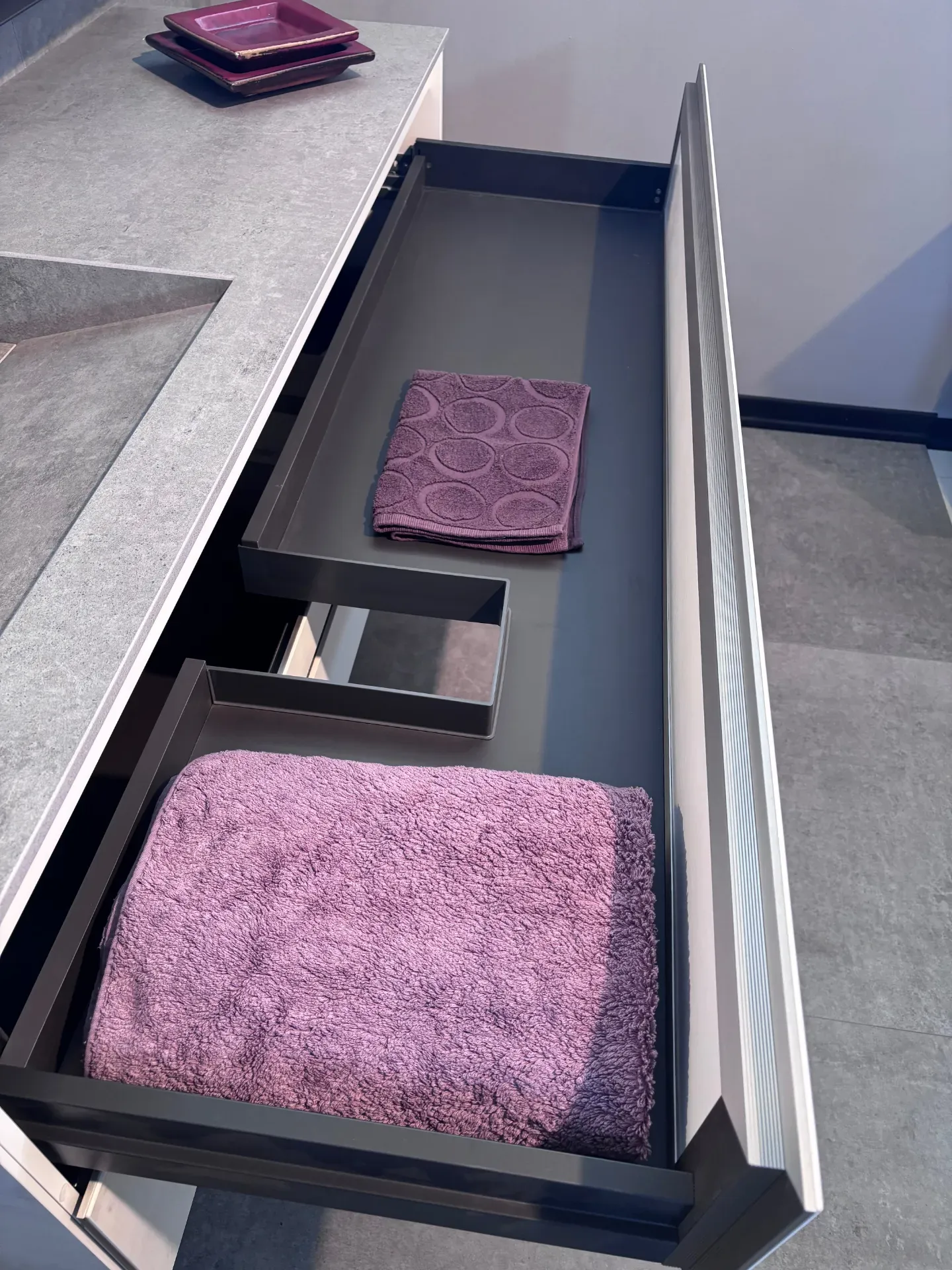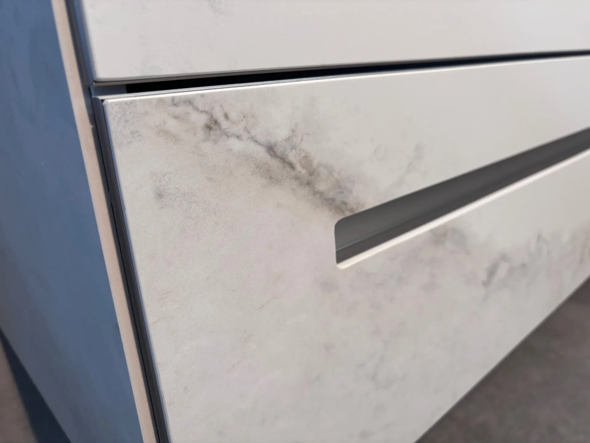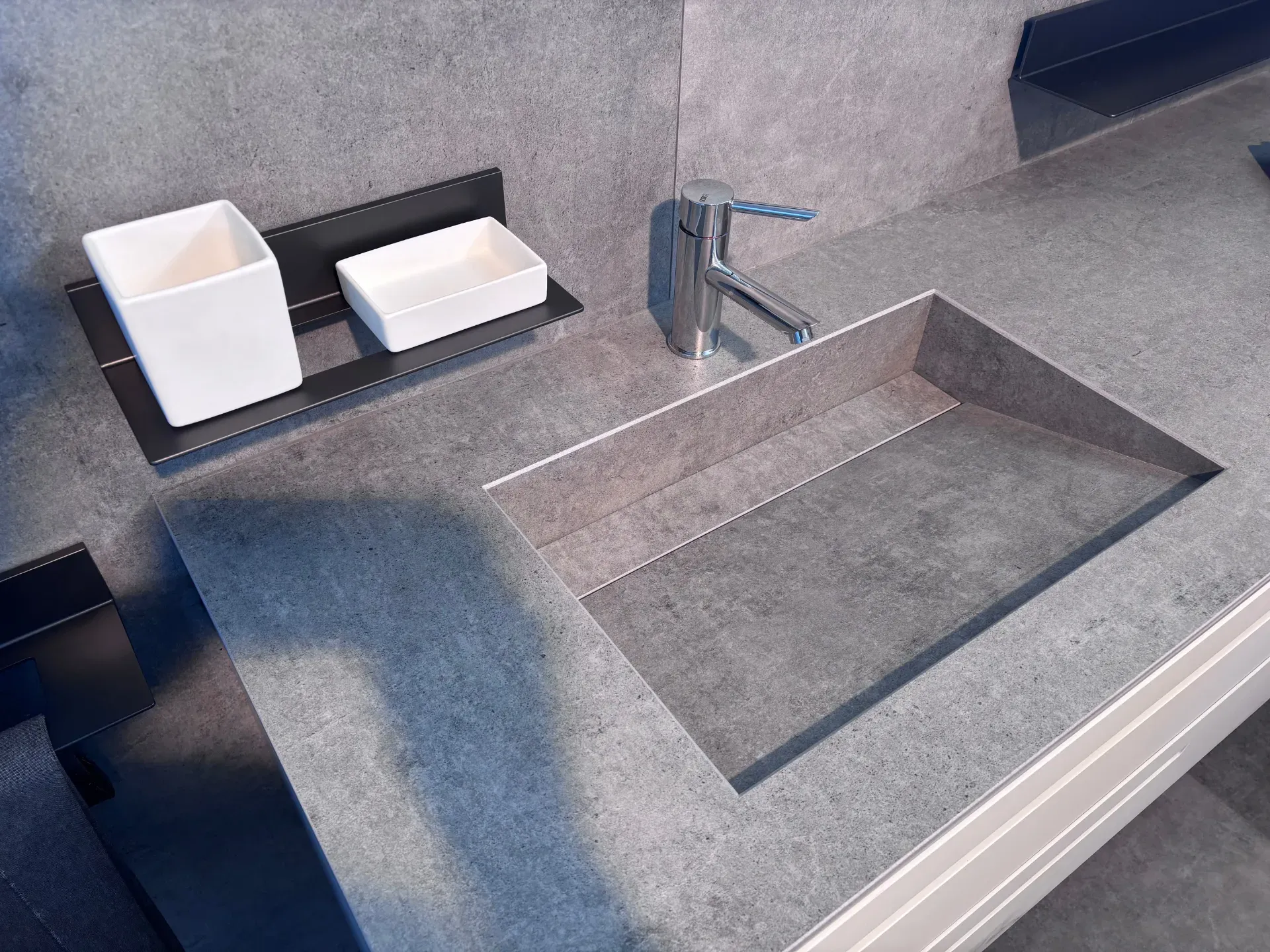 Il top è in DEKTON spessore mm 12 nella finitura CRETA ed ha il lavabo integrato con piletta a scomparsa.